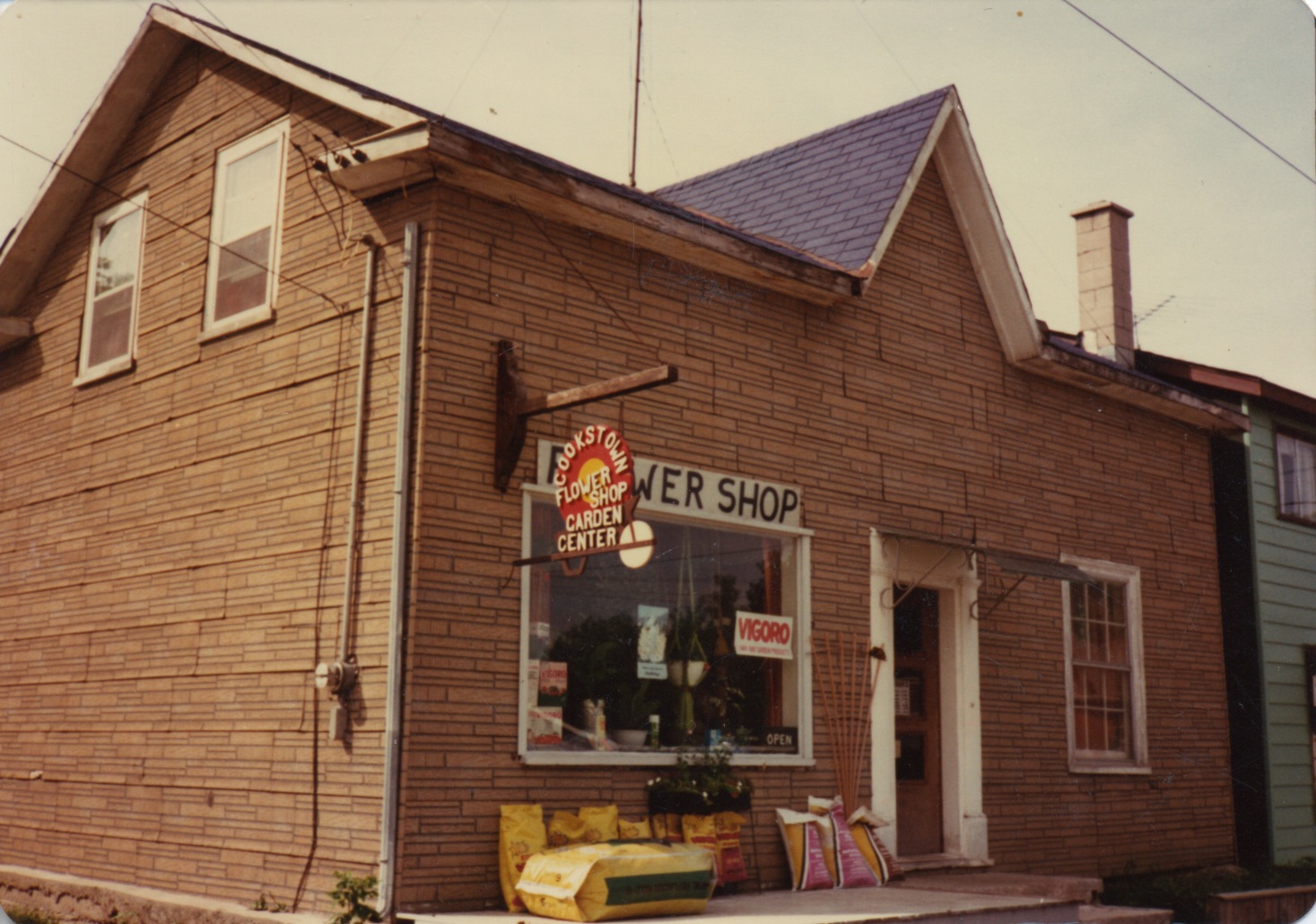 Photo of the exterior of the Cookstown Flower Shop, which was located on 21 Queen St. from 1975-1980. It was owned and operated by Sharon and William R. Evans. The site was originally home to Charlie Hamilton and his harness shop in the mid-1800s. The building features a distinct brick pattern on the outer walls and a hanging sign that reads "Cookstown Flower Shop - Garden Centre."