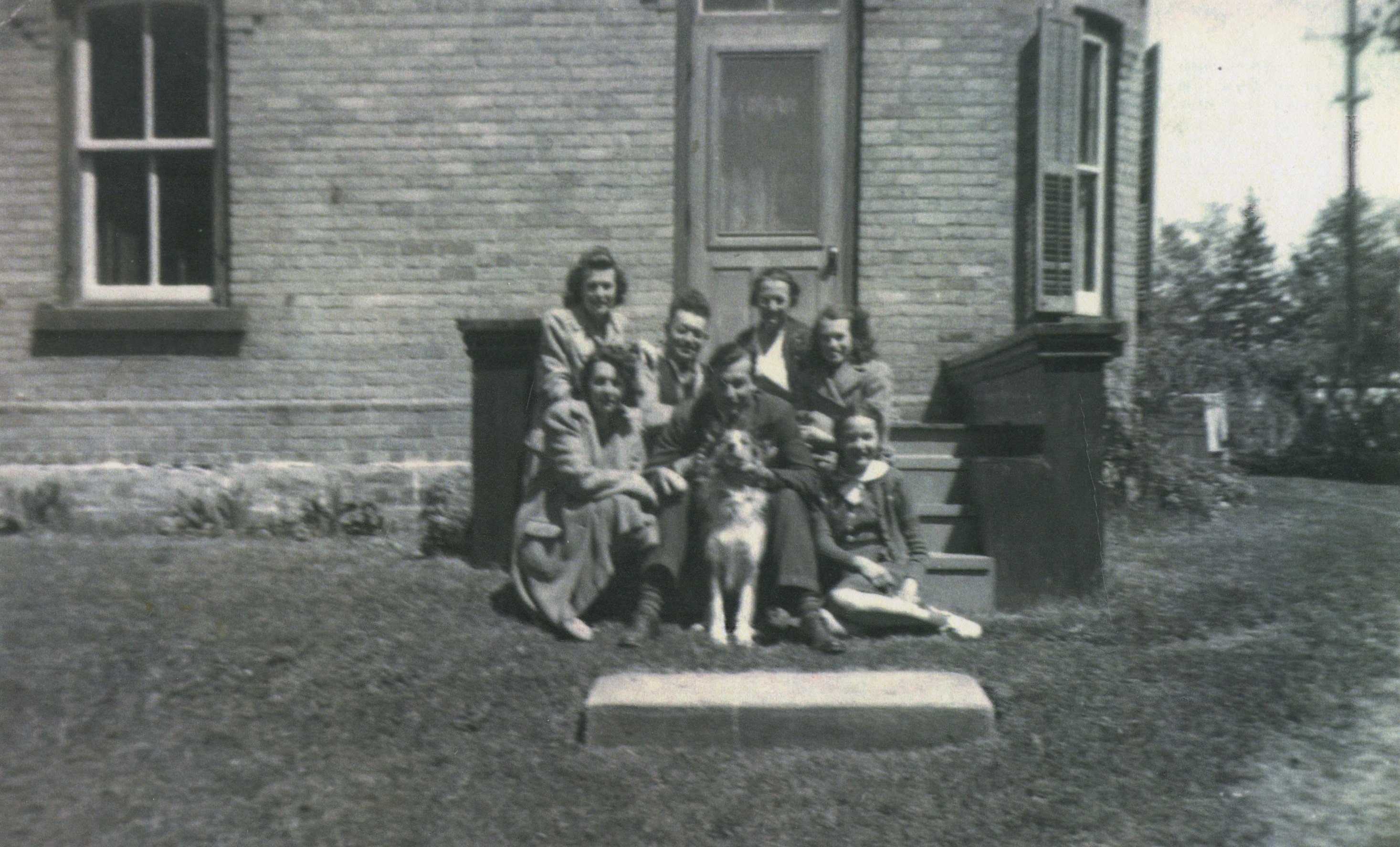 Group photo of the Kidd family taken c. 1940. Pictured from left to right - Back Row: Joan (Kidd) McLean, Arthur Kidd, Josena Kidd, and Molly (Kidd) Couse. Front Row: Bette (Kidd) Lozo, Jack Kidd, and Patricia Kidd, with Buster the dog. All are the children of Arthur and Josena.