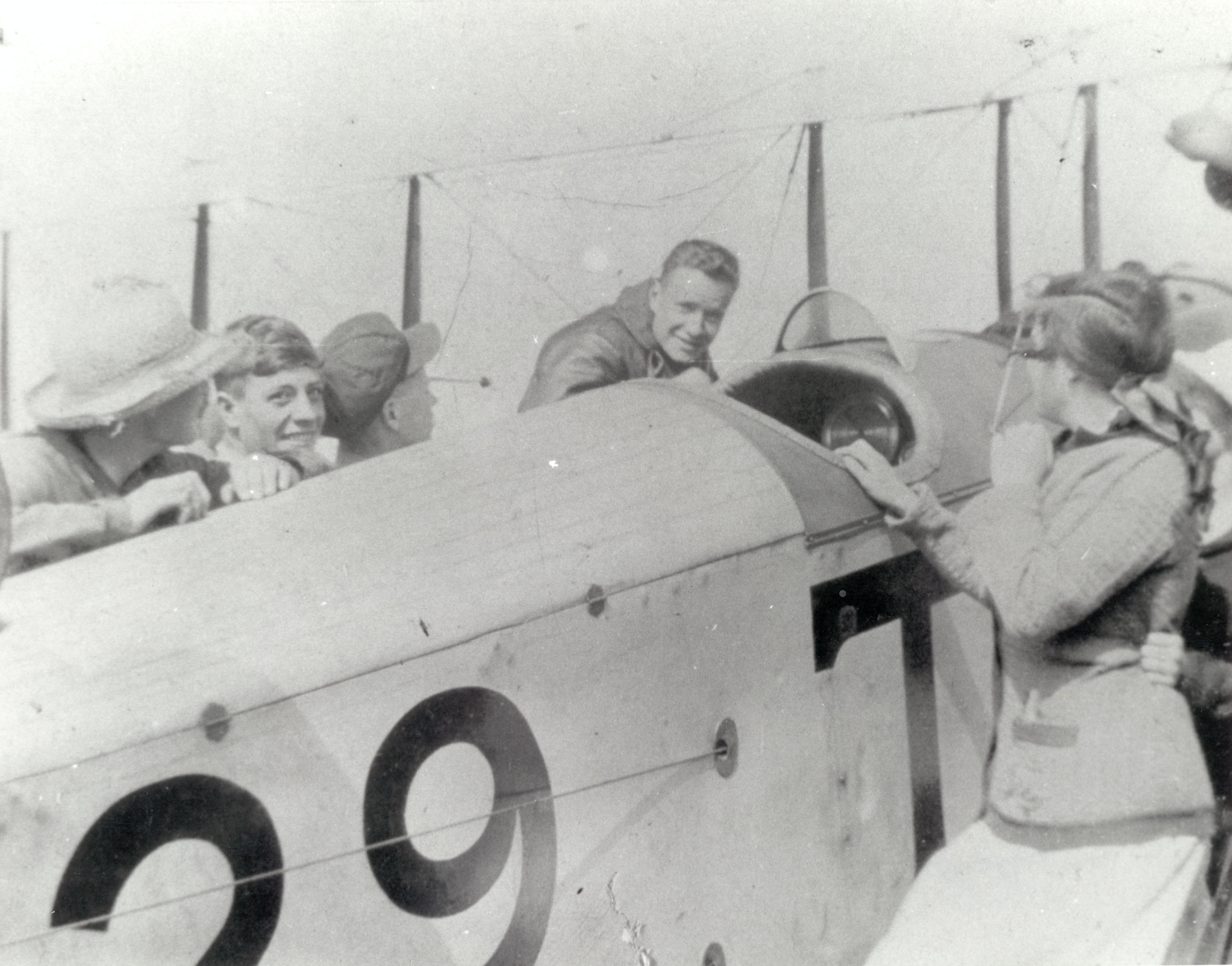 The black and white image shows five people standing around a landed plane. There are three boys/men on the furthest side with the pilot, and a woman standing on the opposite side. The airplane from Camp Borden landed on NH of Lot 19, Concession 7. The airplane had gotten lost in the fog and almost ran out of fuel. The craft landed on Frank Brewsters farm. After getting five gallons of gasoline from Mr. Alf Martin, the plane took off for Camp Borden.