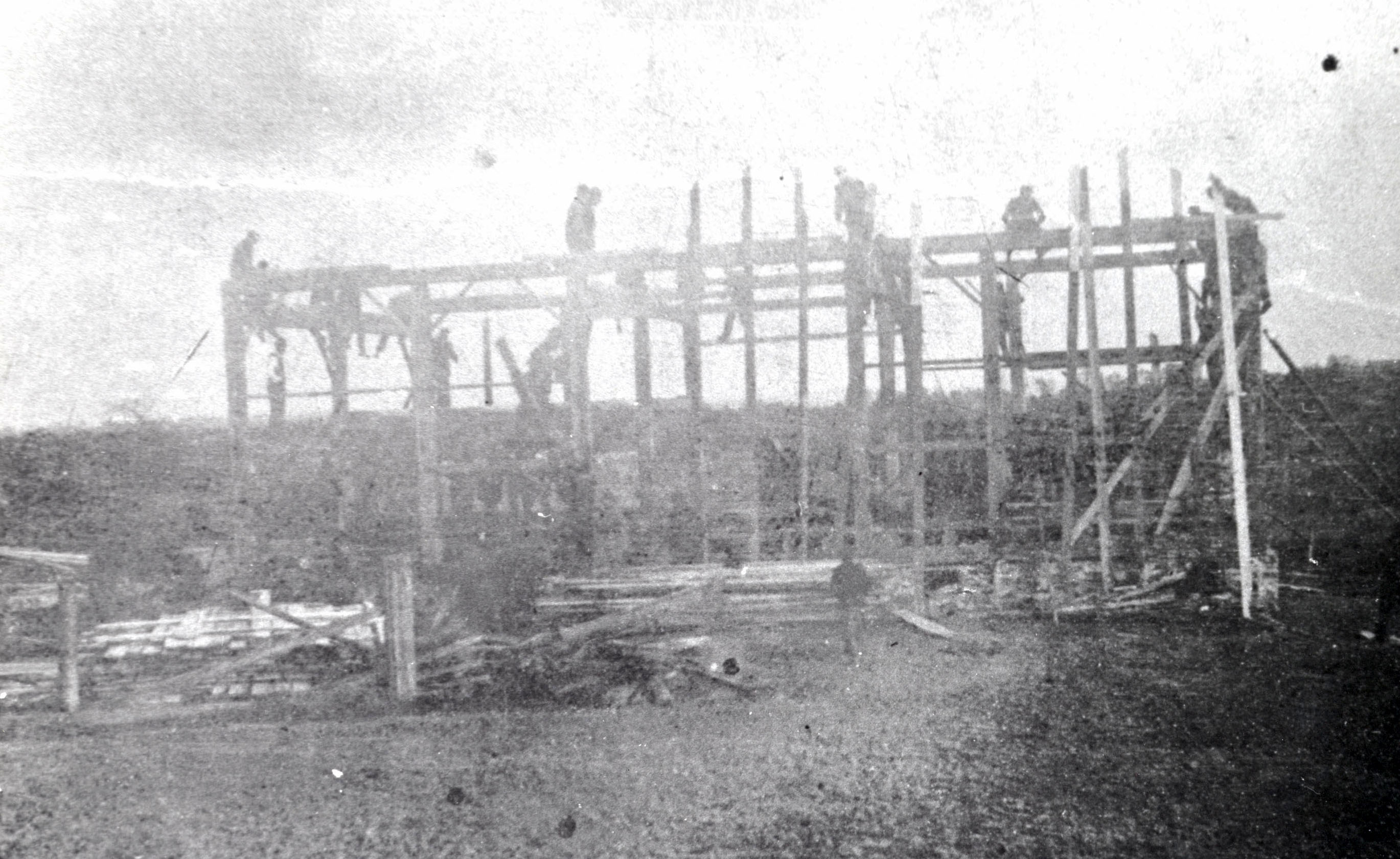Barn Raising. Miss. Betty O'Connell's home farm. House and barn burned down 1914.
