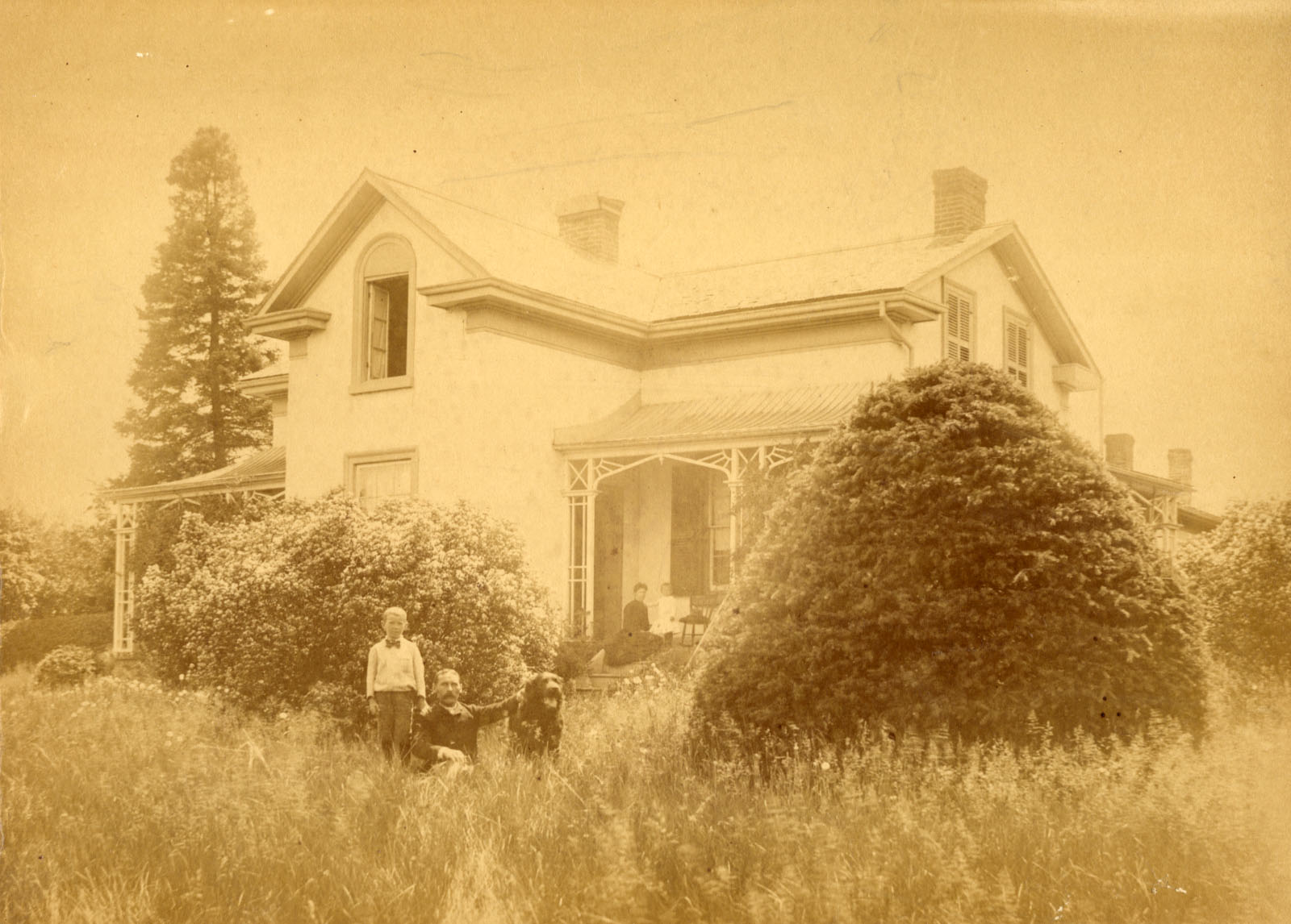 Photo of the Blain family at Woodlawn. James A. Blain, Tom and Pronto the dog in the foreground, and Mrs. Helen Blain and Billy on the veranda.