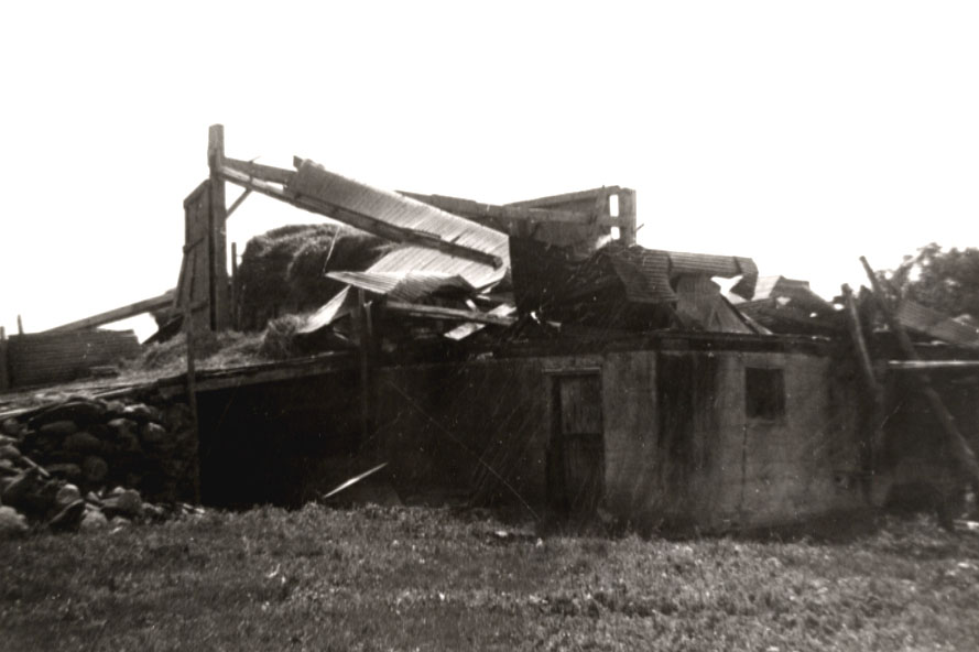 Image taken in 1957 of a barn that was blown down during a storm. The barn can be seen collapsed on top of the stone foundation. The barn belonged to Don Beatty and was located on lot 17, concession 7.