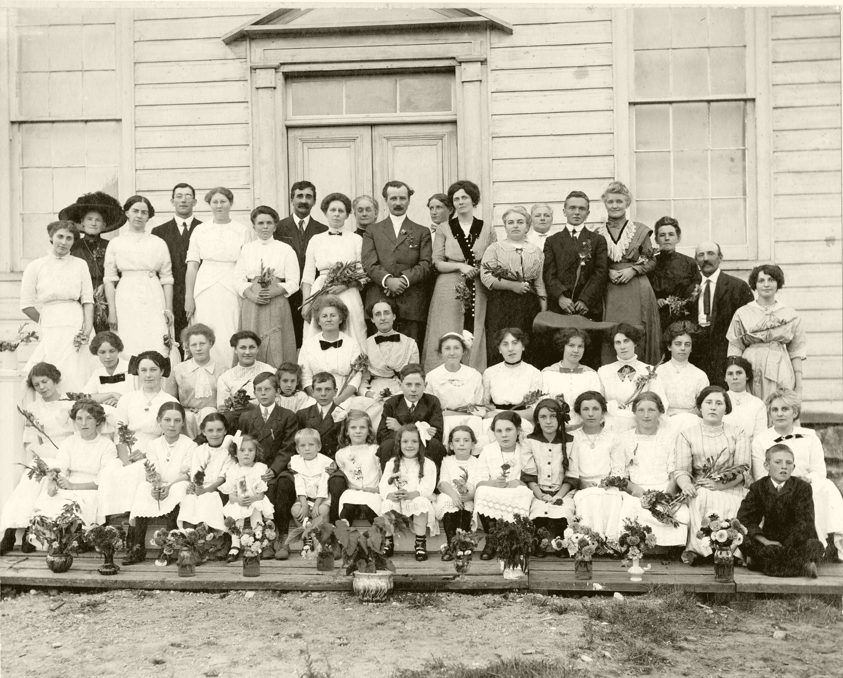 Taken on the steps of Presbyterian Church Lefroy. Music Recital Class of Elsie Nelson and their parents. Standing (l-r): Birdie Cross, Mrs. Steve Marshall, Edith McCullough, Tom White, Jennie Reid, Mrs. Frank Whan, Isaac Morton, Mrs. Rev McKenzie, Mrs. Tannahill Sturgeon, Rev McKenzie, Mabel Stewart, Elise Nelson (music teacher), Mary Cowan, Mrs. Isaac Morton, Donald Cowan, Mrs. John Cowan Sr., Mrs. Tom Reid, Tom Reid, Isabel Allen Second Row (l-r): Hazel Neelands, Florrie Neelands, Hester Black, Sadie Leonard, Hazel Morton, Mrs. Chas. McClennan, her sister, Mabel McClennan, Mildred Wallace, Lydia Jack, Edith Northgraves, Libby Sturgeon, Jean Nelson Third Row (l-r): Lilian (Lillian) Reid, Elise Ambler, Alma Whan, Grace Nelson, Dwight Nelson, Marjory (Marjorie) Reid, Irving Nelson, Douglas Nelson, Helen Nelson, Jack Tarbrush (Angus), Priscilla Willson (Angus), Margaret Sutherland, Jean Tarbrush, Carrie Nelson and Wm. Reid.