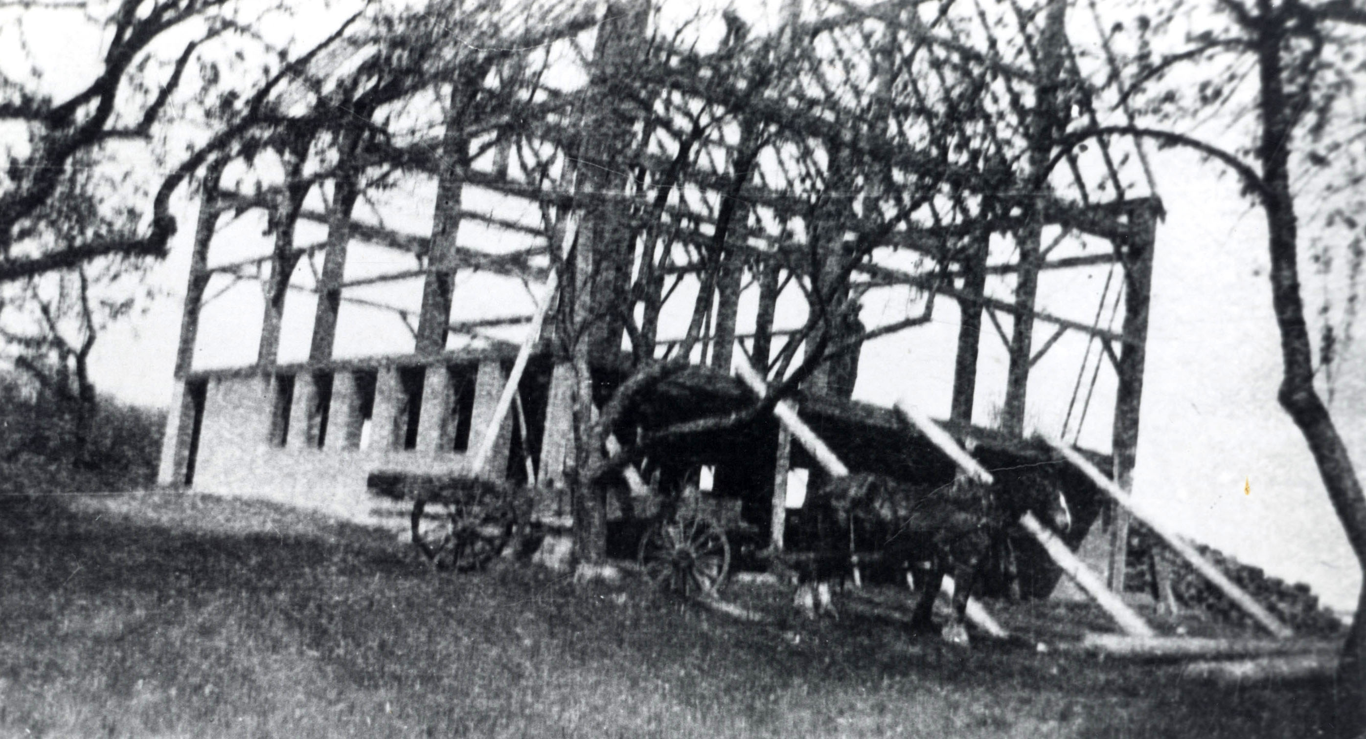 The frame of a barn after a barn raising, 1935. Farm of Annie and Jim Leonard (son of John Leonard).