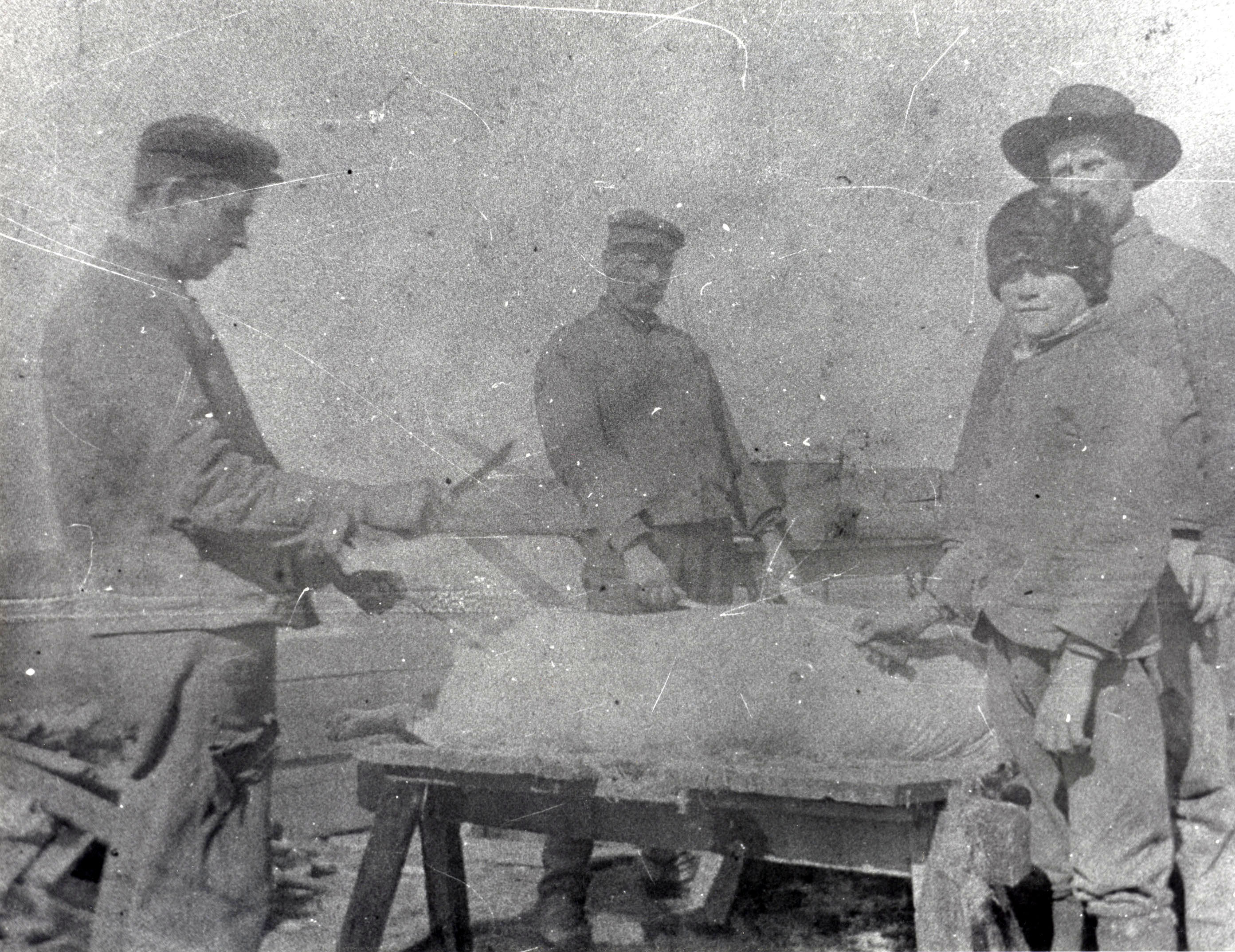 Butchering day, likely at the William Martin farm. He is wearing the fedora.