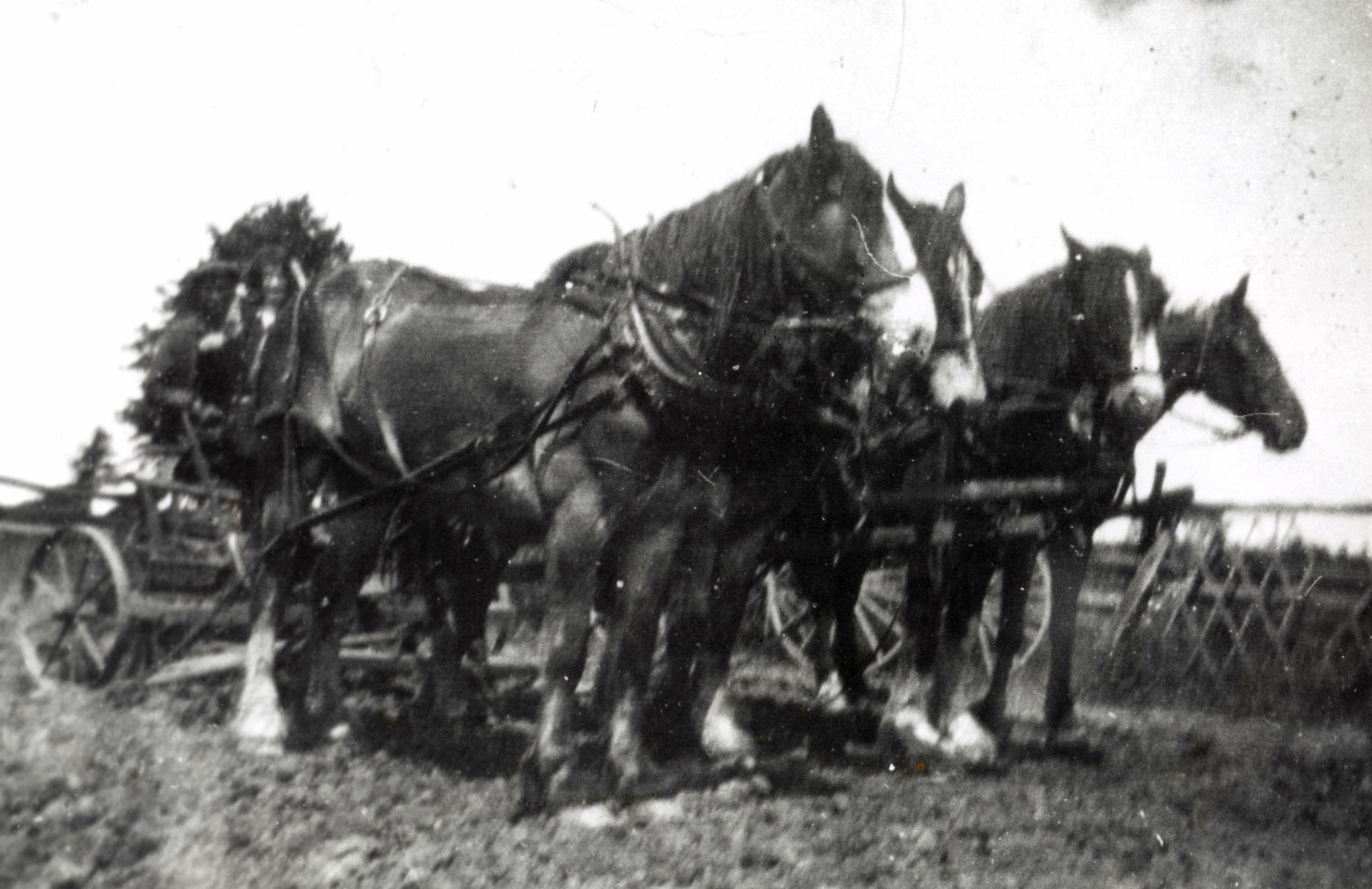 Robert Lamb with four horses on a cultivator. Don Beatty and John Cowan added the following information: Mr. Lamb farmed with horses all the time. When the Reardons took over, they farmed with horses too.