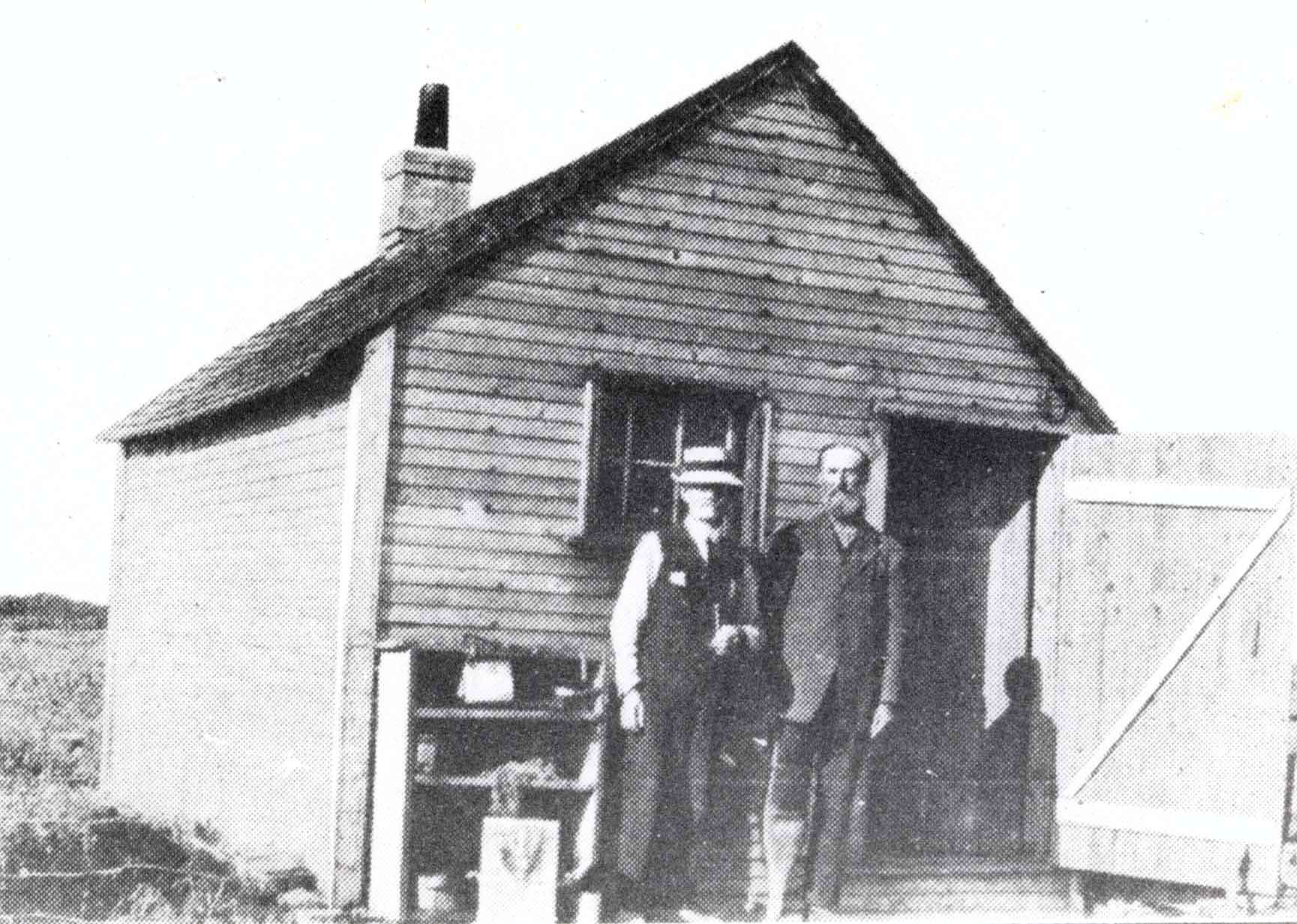 Home of John Worth Campbell (left), a poet. Also pictured is Ben Lebar. John Worth Campbell, an Englishman, came to Bell Ewart around 1900 as an old soldier and remittance man, and bought a lot on the west side of Frederick Street from Adolphus Trombley, about 300 yards from lake. He built a small cabin and lived with a companion Ben Lebar, who had a wooden leg. Campbell painted his poetry on large stones around his cabin. The cabin caught fire and burned down in 1917.