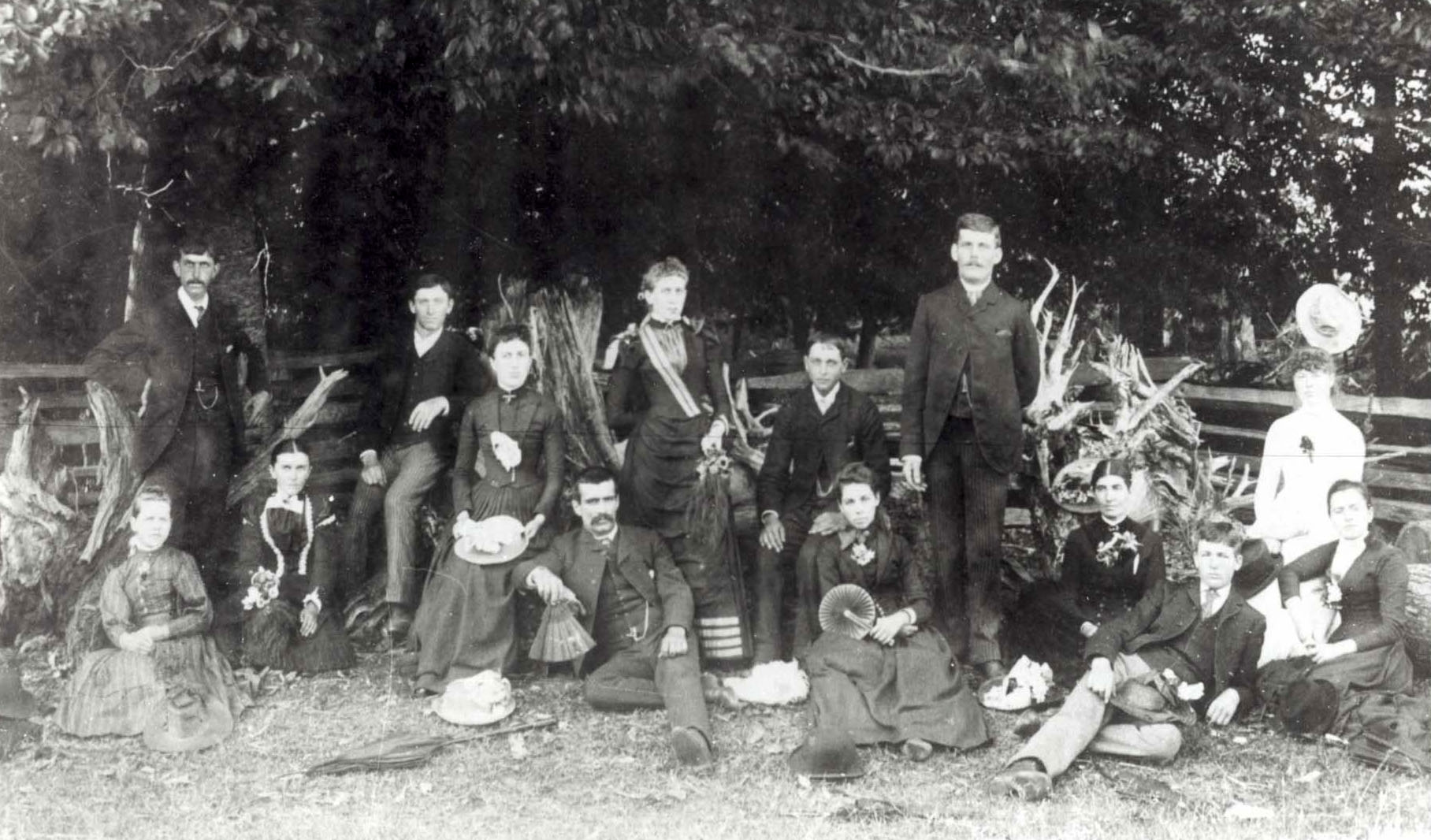 Group photo featuring the following people: (left to right, zig zag) Anne Booth, Thomas Calder, Miss Booth, William Calder, Allie Sloan, Charles Wice, Elizabeth Calder, Joseph Booth, Olive Victoria Quantz, James Booth, Margaret Quantz, William Coulter, Ethel Coulter, and Penninah Wice.