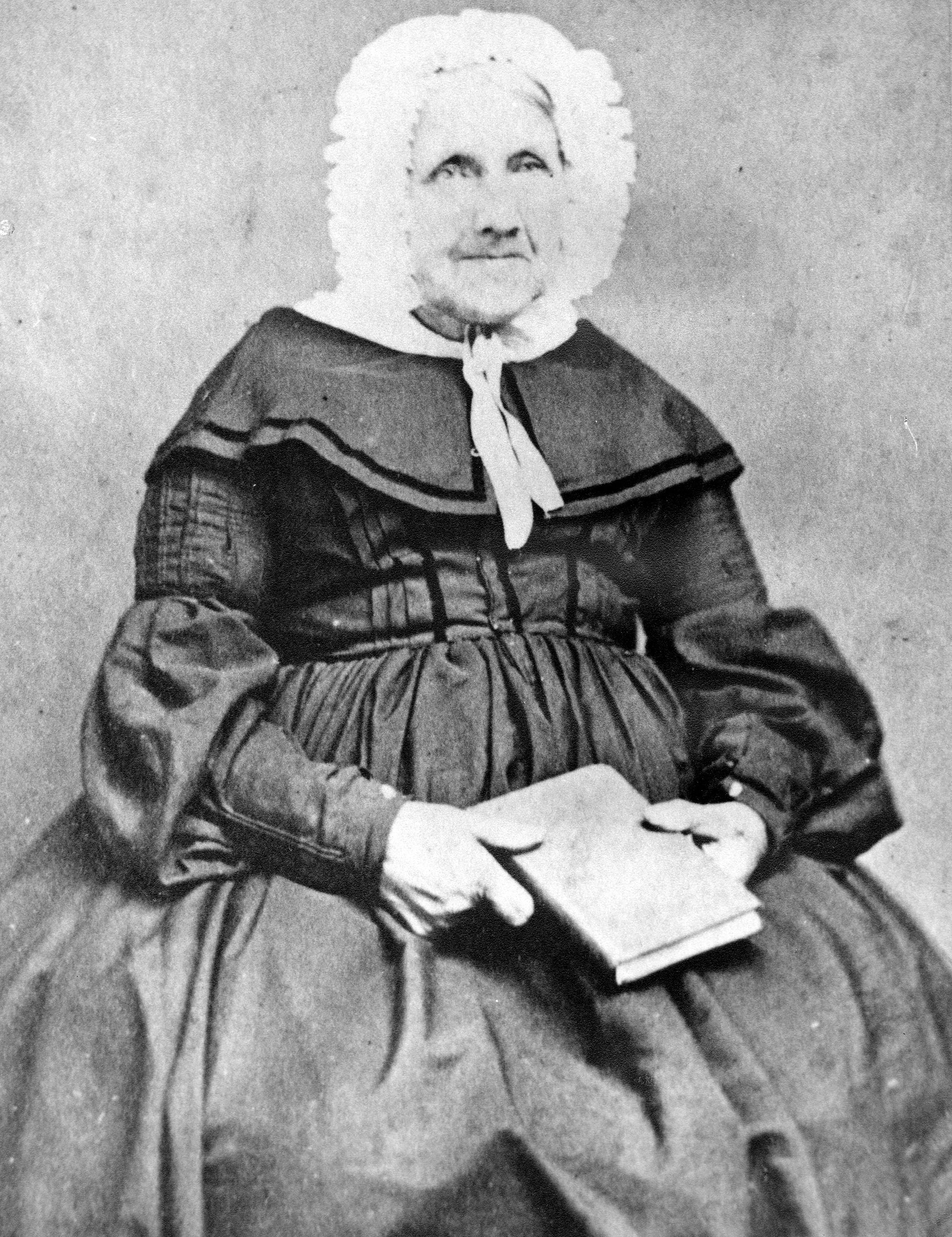 matron woman bonnet book dress fashion