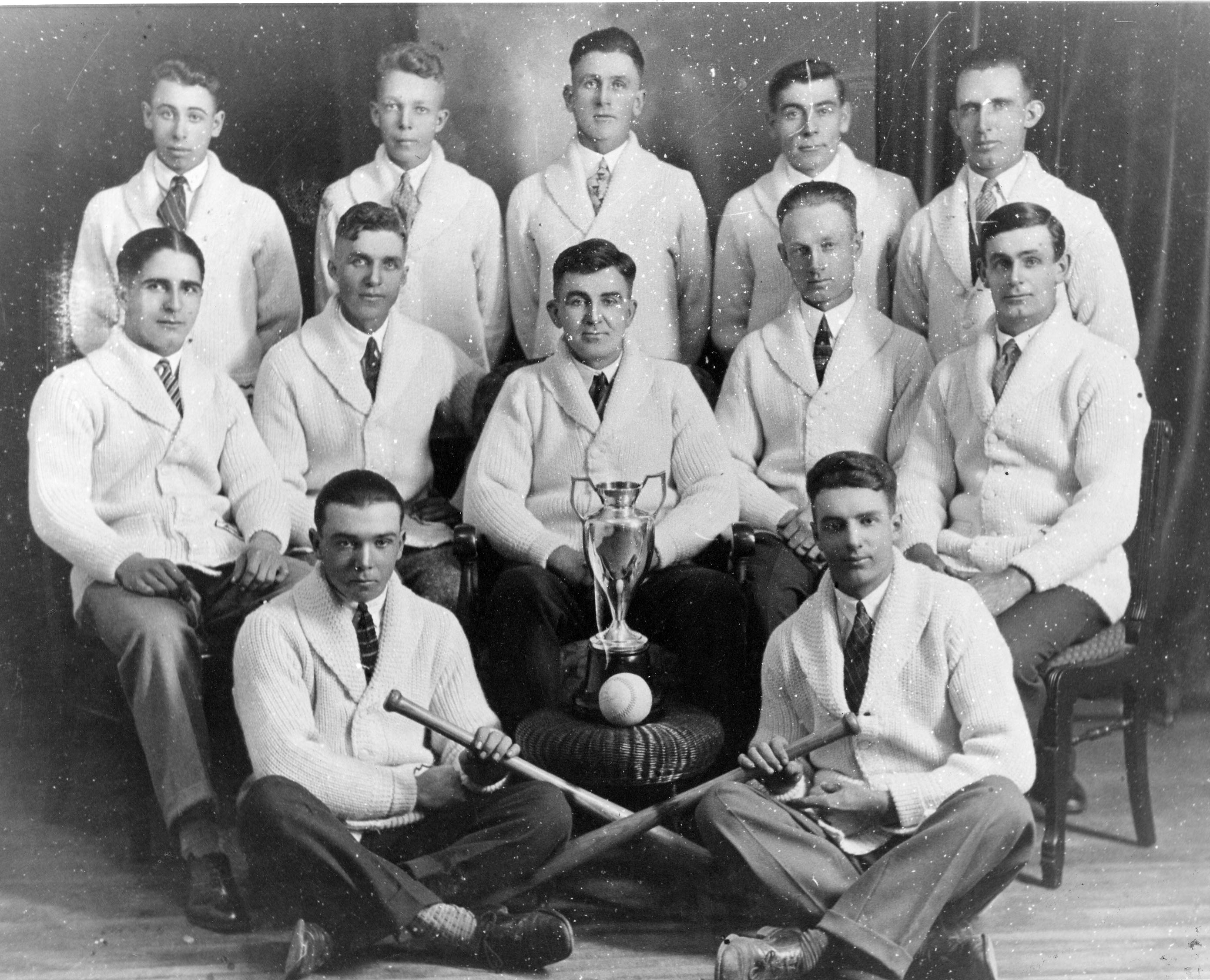 Studio group photo of the Lefroy Softball Team in 1930 with a championship trophy. The men are standing, seated, and sitting cross-legged on the floor in the three rows respectively, and are wearing matching white cardigan sweaters and ties. Pictured from left to right, front row: Clarence (Tillie) Whan and Jack Reive. Middle row: Fred Hart, Marshall Reive, Milton Reid, Irving Robertson, and Ed Payne. Back row: Gordon Browning, Ralph Reive, Norman King, Ivan Grose, and Byron Grose.