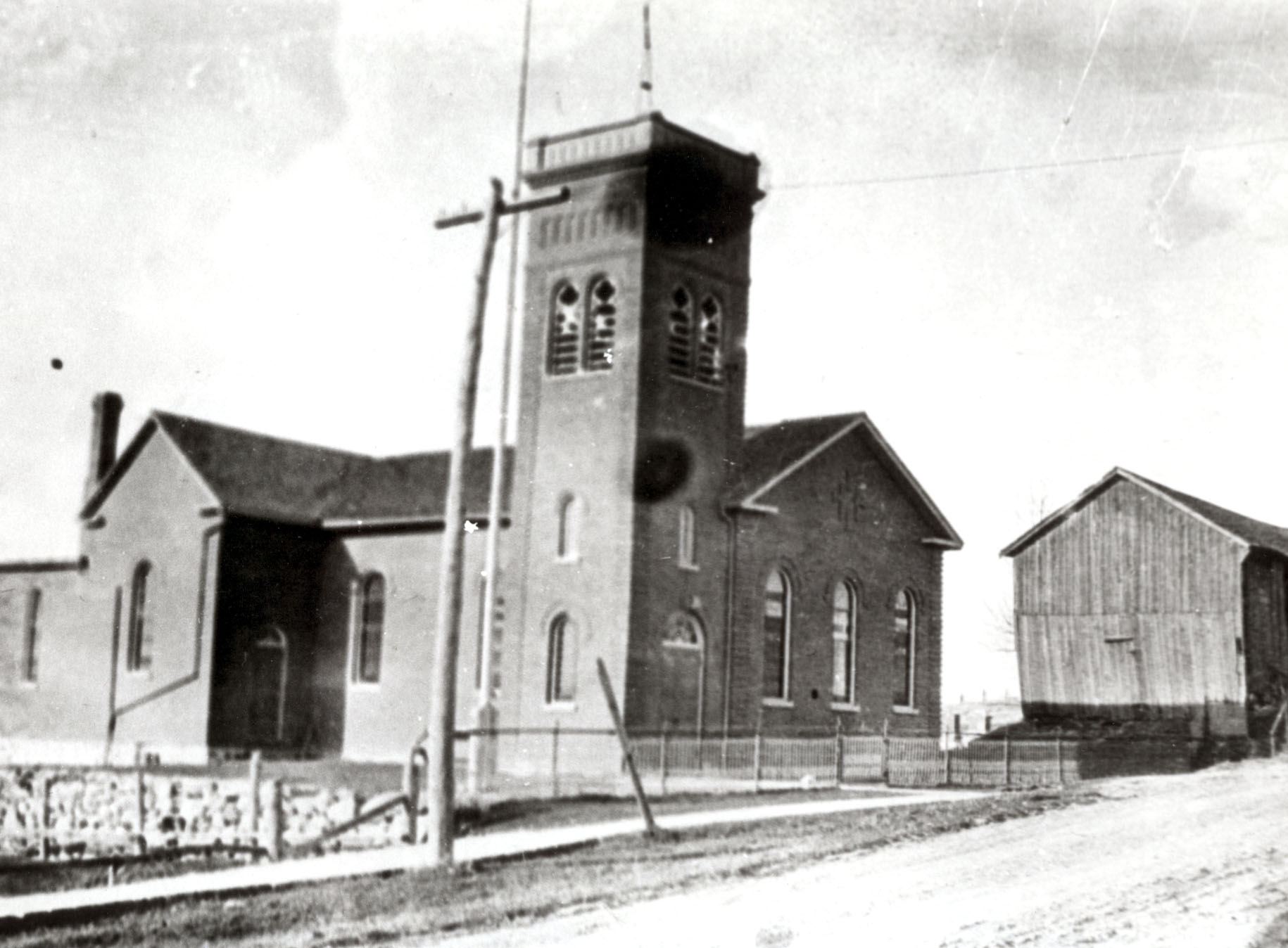 The Cookstown Anglican Church in the early 20th century. Pictured beside the church is the shed where parishioners would tie their horses on Sundays. The shed was later moved to the Agriculture Park entrance in Cookstown, and eventually torn down. A board sidewalk and telephone pole are visible in front of the building, which maintains the same architecture of a squared bell tower and rounded arch windows into the 21st century.
