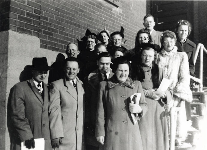 The Sunday School staff of St. James United Church on the occasion of St. James' Centennial (1852-1952). Pictured from left to right in the top row: Lloyd Cumming, and Mrs. Earl Shannon. Second Row: Mrs. Elmer Pratt, Mrs. Bruce Wice, Mrs. Roy Goodfellow, Velma Hubbert, and Mrs. Fred Mulholland. Third Row: Roy Goodfellow (superintendent), Jack Marquis (secretary), and Mrs. Herb Black. Front Row: Keith Constable, Ross Hubbert, Ross Wallace, Mrs. Lloyd Cumming, Mae Ferguson.