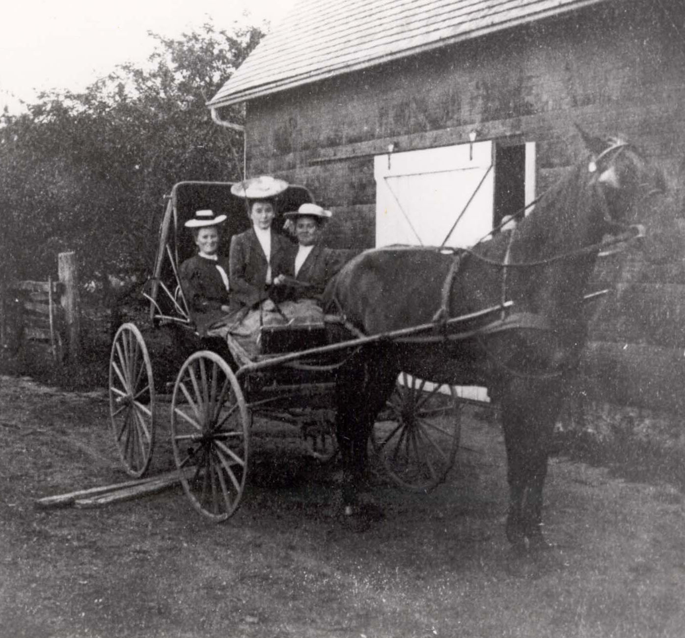 Photo of Mabel Guest (1883-1940), Pearl Soules (1887-1956), and Myrtle Guest (1880-1967) riding in a horse and buggy. Pearl Soules was the daughter of John Soules and Annie Guest. All three ladies are wearing broad brimmed sunhats and dark jackets.