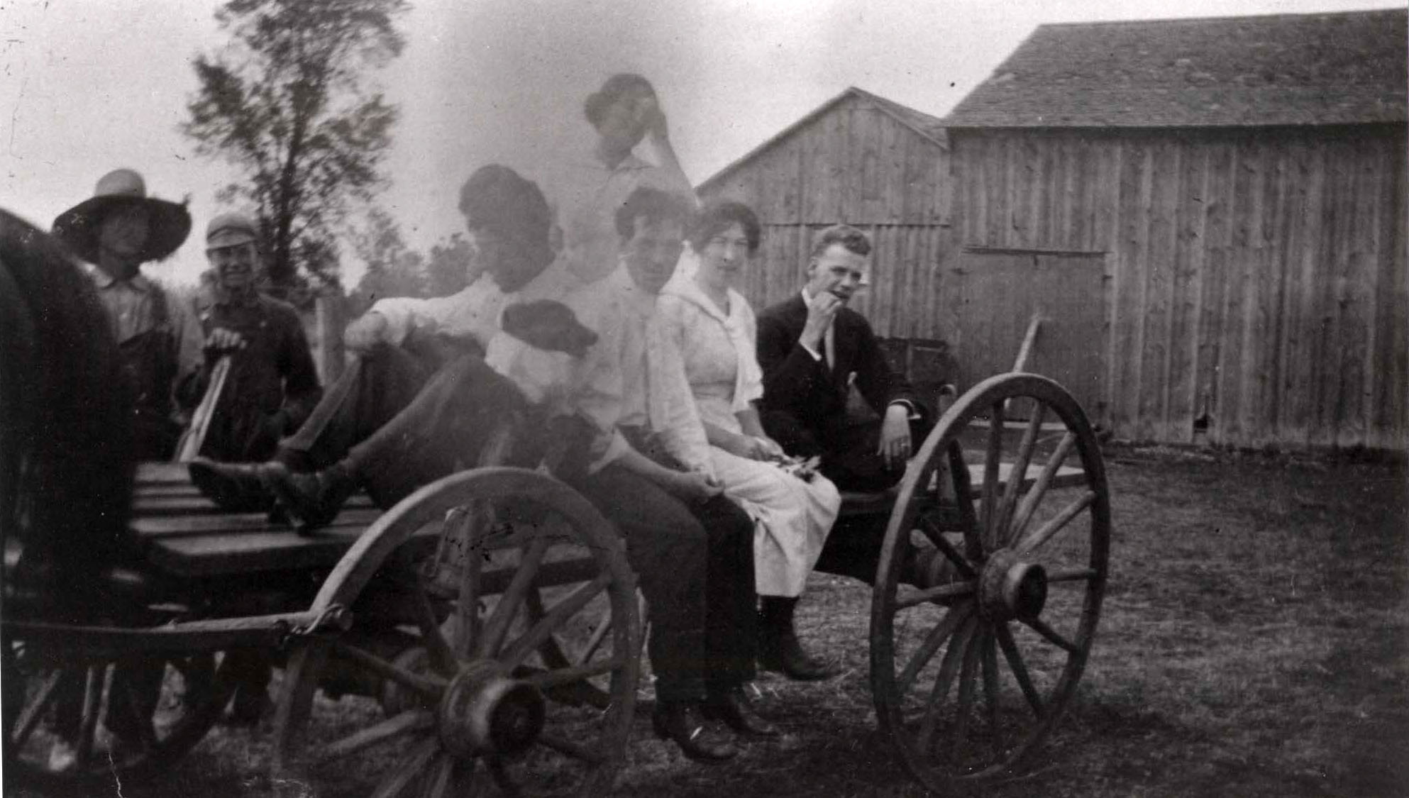 Photo of a wagon ride taken on the Latimer farm. Pictured second from the right is Lena Latimer, and standing behind her is Margaret Latimer. Three other unidentified men are also on the wagon, with the man in the front holding a dog in his arms. There are two additional unknown men in overalls standing behind the wagon, on the left side of the photo. Two of the men are wearing long sleeved white shirts and pants, while the man at the back is in a full suit. The two Latimer ladies are wearing long white dresses.