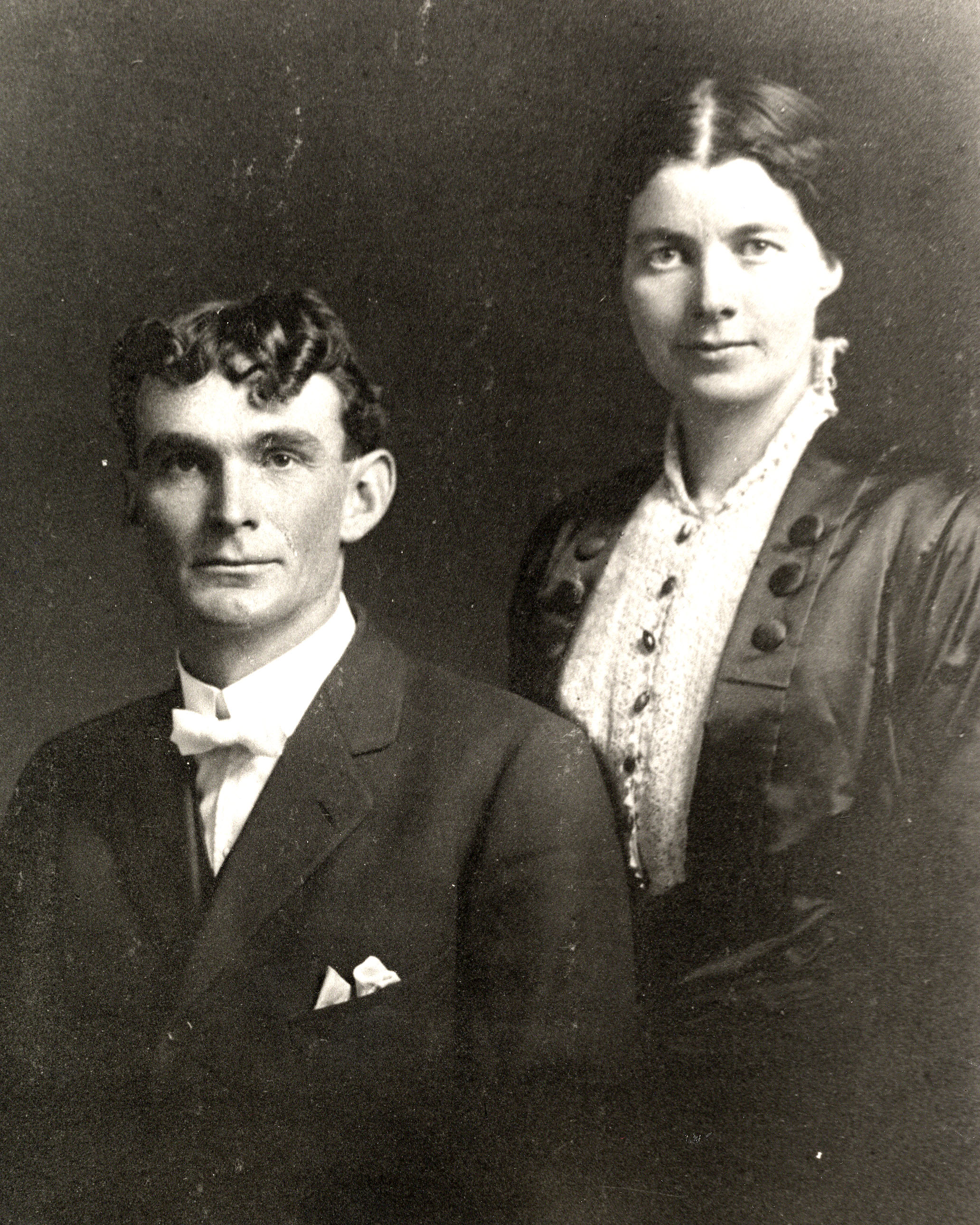 Wedding day portrait of Hugh and (Annie) Mabel Donnelly. Hugh was the son of Hugh Donnelly II and Rebecca Wray. Mabel was the daughter of Robert Stewart and Monica McCullough. They married on 17 February, 1915 and had four children: Jean, Louella, Marie, and Stewart.