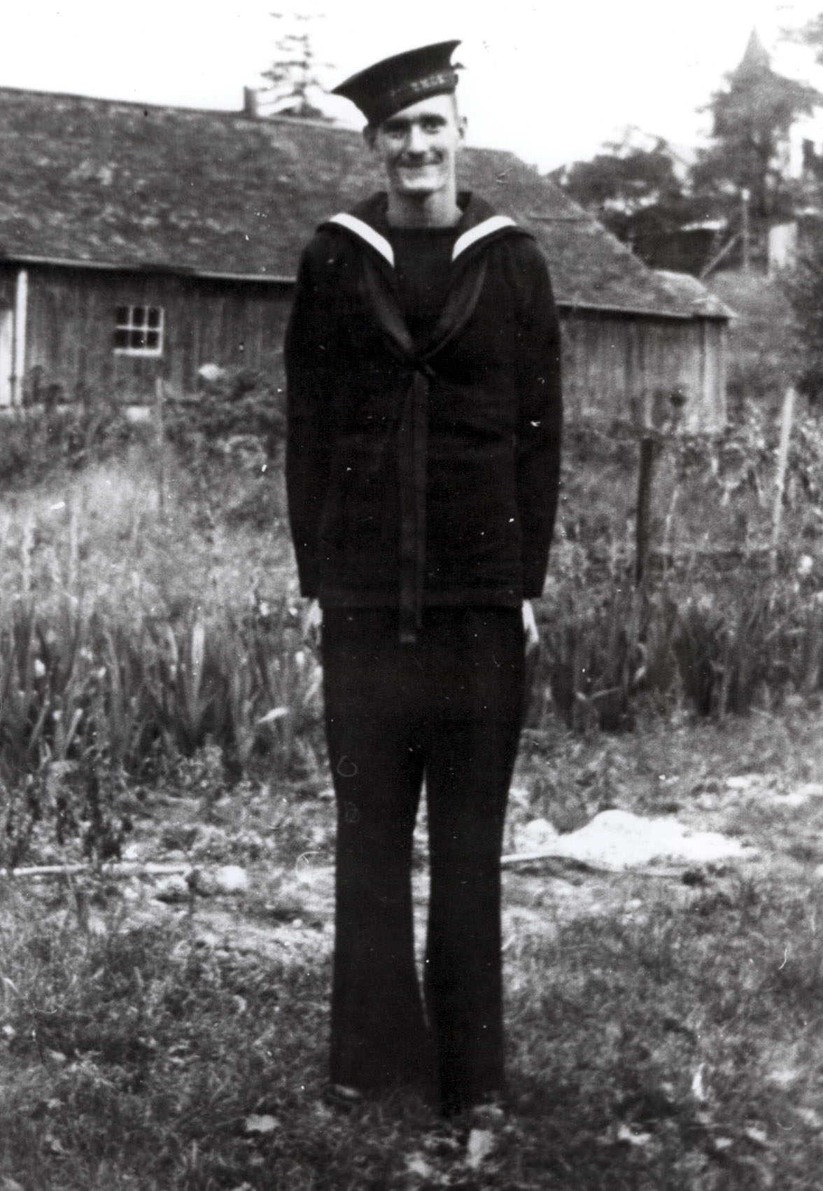 Photograph of Byard Donnelly, a sailor in the navy in the Second World War. In the background is the old Churchill Curling Rink, built by Davie Lennox in 1900 and purchased by Edward Sloan in 1909. It was located on Pt. Lot 16 - Village Plan 162 (Pt. Lot 10).