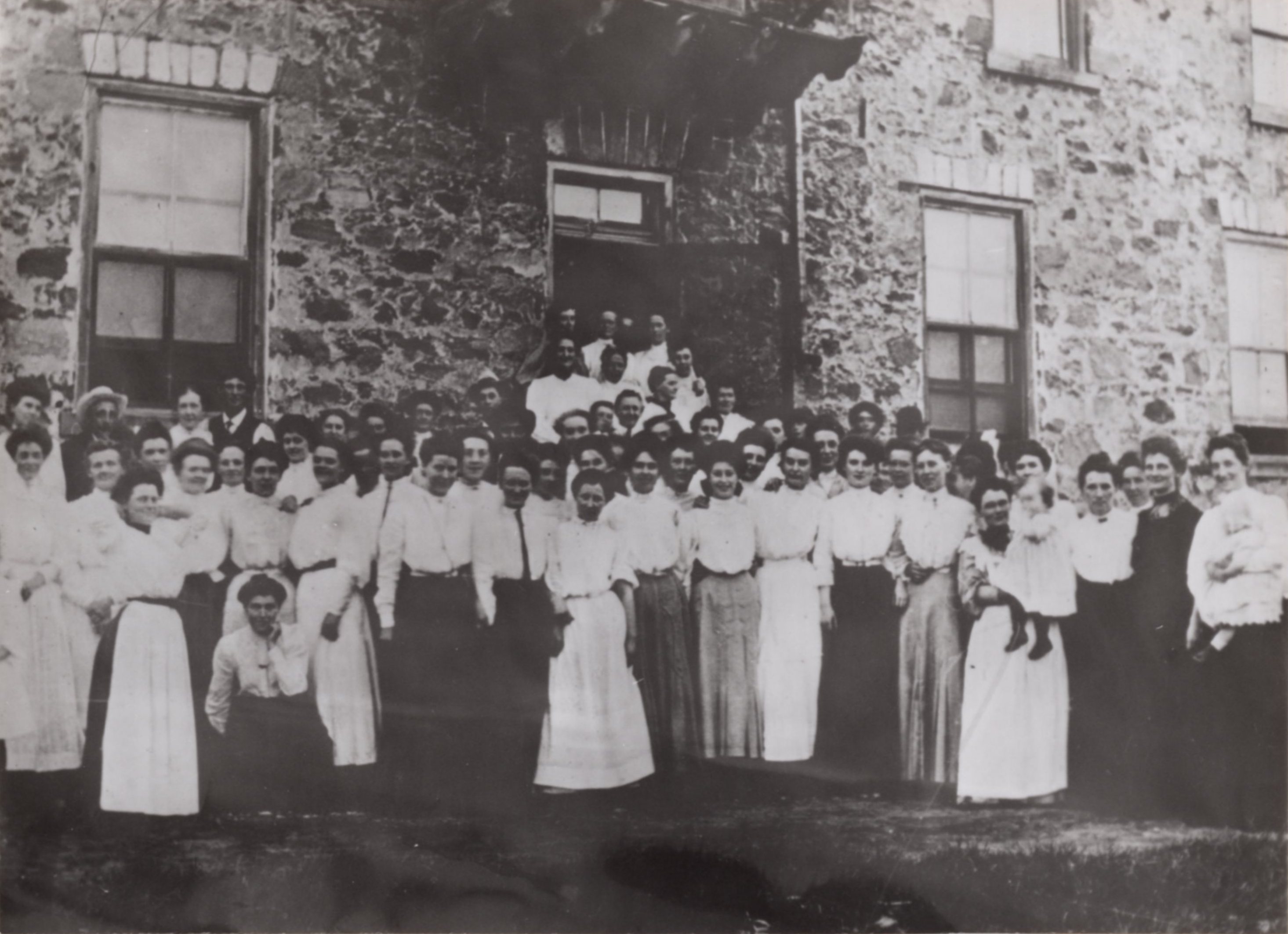 Photo of a group of ladies from throughout the community who attended the Chris Grose barn raising in 1906. The first woman in front on the left with a long white apron, is Alice Grose (Mrs. Jack Hilland). In front, second from the right is Joanna Grose (Mrs. Touse Bateman).