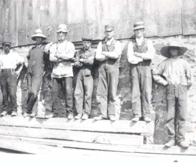 Image taken in 1910 during the barn raising at Frank Sawyer's farm. In the image, seven men can be seen wearing work clothes and leaning up against the side of the barn. Barn raising was a community event during this time.