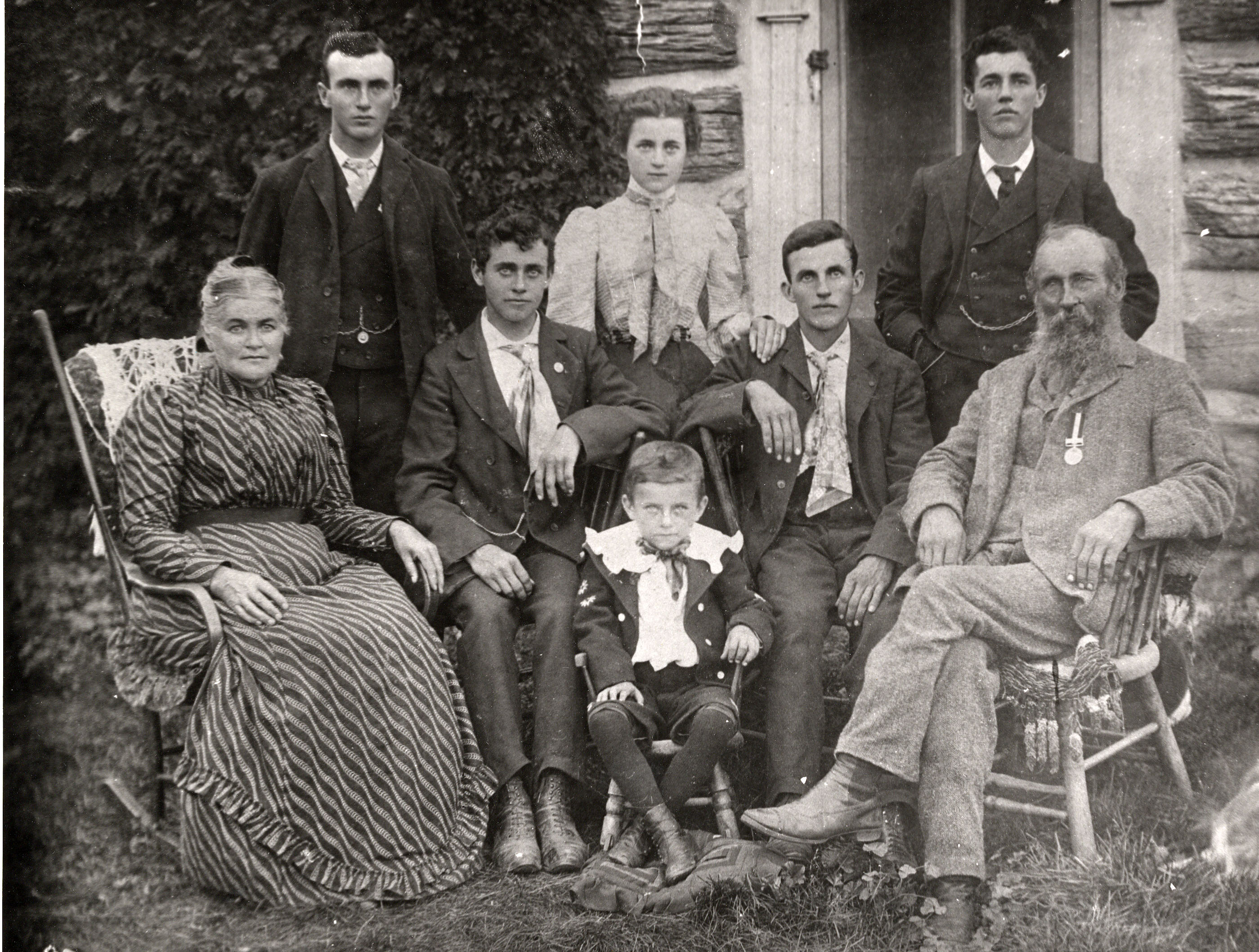 The Coleman family was one of the first pioneering families in Innisfil. Three Coleman brothers (Richard, John, and William) lived on 200 acres of land at the second line of Innisfil after moving from County Donegal in Ireland in 1834. Pictured are Letitia Coleman (née Jones, far left), and Richard Coleman (far right), and their six children. In the back row, centre is Catherine "May" (later Mrs. Ferrier), and front row, left of centre is Ogle Cameron. The other sons were Harvey, David (known as Harry), Robert (known as Bob), and Stewart (known as Gowan). Both Bob and Ogle later moved west to Manitoba in 1904 and worked there in partnership, known as Coleman Brothers in Killarney, MB. Ogle eventually established himself in Limerick, Saskatchewan, soon followed by Gowan. Only Harry and May remained in the Innisfil area.