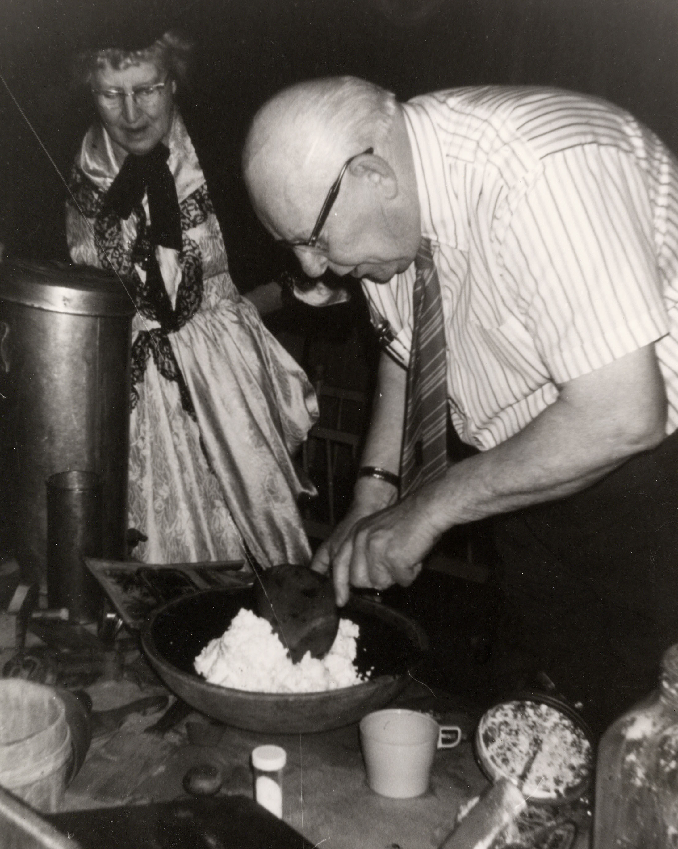 Herman Cauthers demonstrates butter making at the community fair. See also: http://www.ourstoriesinnisfil.ca/fedora/repository/ourstories:2003