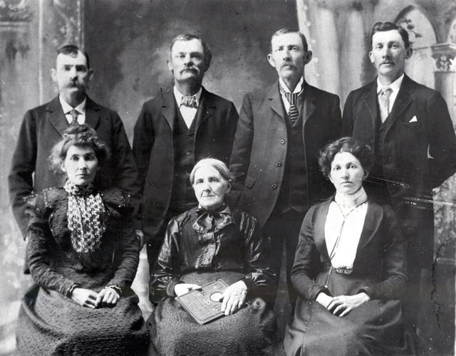 Portrait of the Hubbert family. Pictured from left to right - Back Row: Jonathan Hubbert, John Hubbert, William Hubbert, and Wilti Hubbert. Front Row: Rhoda Hubbert, their mother Ann Hubbert (née Teasdale, d. 1924), and Thursa Hubbert.