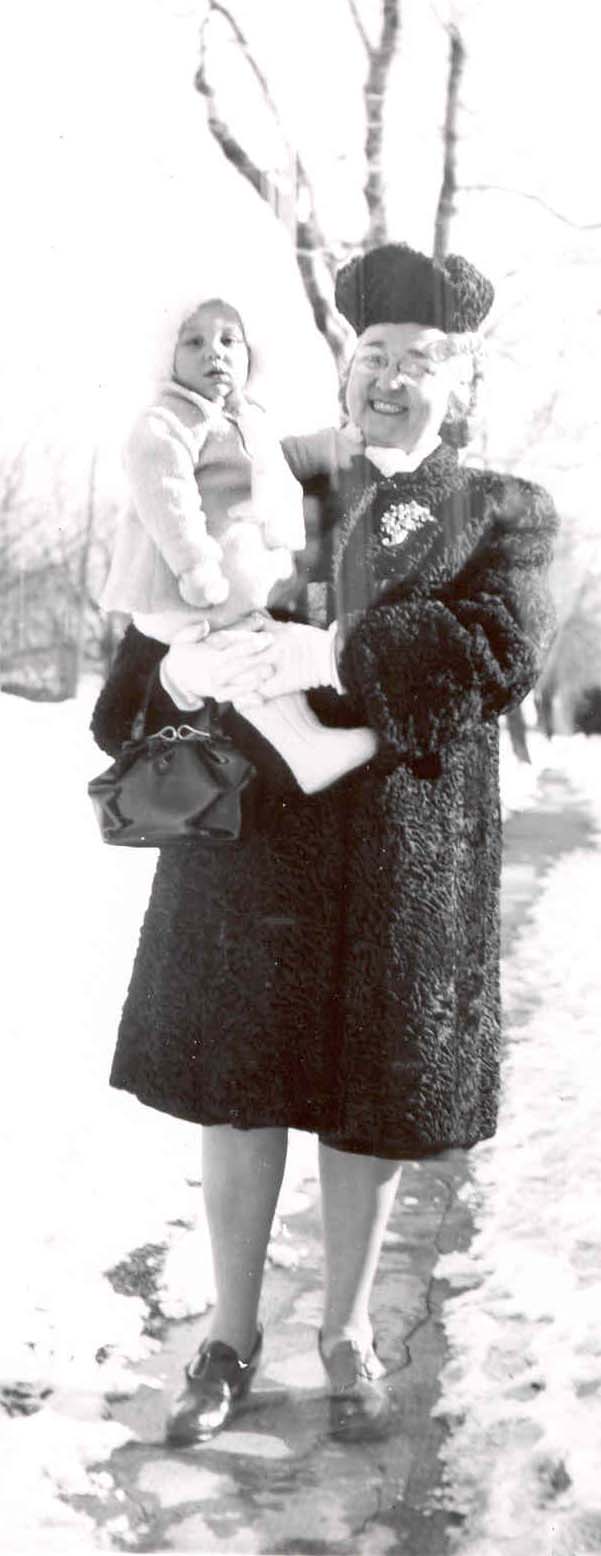 Photograph of Mrs. Jessie D. Monkman and her grandson Brian. Mrs. Monkman joined the Cookstown Women's Institute in October 1920 and participated in various standing committees and local committees. These included: Home Economics and Health, Agriculture and Canadian Industries, and Citizenship and Education. The Women's Institute also carried a large financial load in re-modelling town hall; convened a bazaar, and organized Hallowe'een and Valentine dances and concerts, teas, sales etc. as well as short courses in leather and reed weaving. They also provided Officer's training classes. Mrs. Monkman acted as the Cookstown Women's Institute Secretary from 1933 to 1935; District Director from 1934 to 1936; President from 1936 to 1938; Treasurer from 1942 to 1945; District Secretary Treasurer from 1940 to 1945; District President from 1945 to 1948; and Member of County Area Board from 1940 to 1948. She was also nominated F.W.I.O. member 1956 and retired from active services in all Women's Institutes in 1956-1957. She was again nominated for F.W.I.O 1956-1957-1958 but refused the nominations due to illness. She was also a Life Member of the local Women's Institute as of approximately 1954.