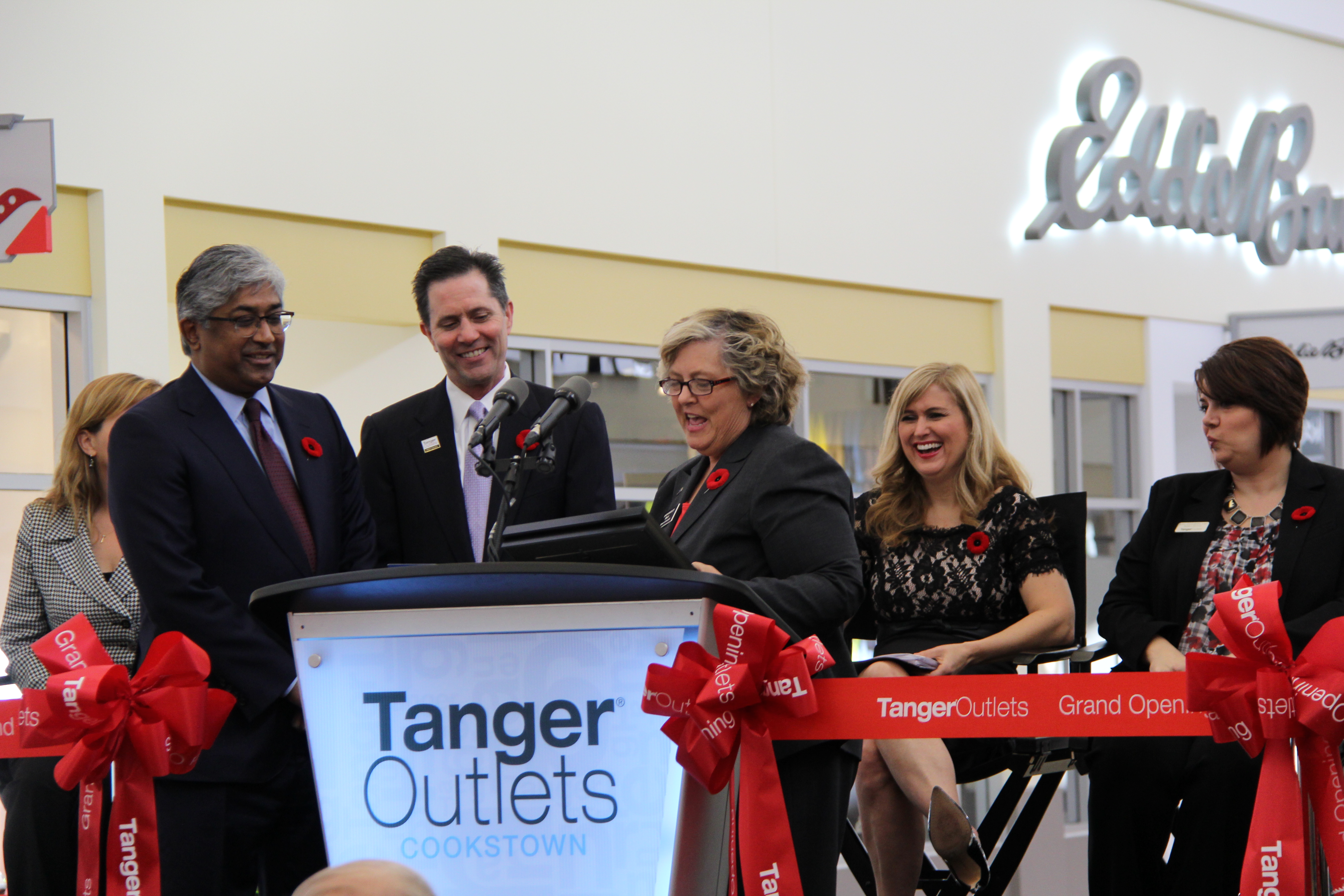 On November 7, 2014 the Tanger Outlet Mall in Cookstown celebrated the grand opening of a 60 million dollar expansion project. The image here captures the opening ceremony of the event. Standing from left to right is Raghunath Davloor of RioCan Real Estate Investment Trust, Thomas McDonough of Tanger Factory Outlet Centers Inc. and Mayor Barb Baguley (2010 to 2014 term) stands at the podium giving a speech. Seated behind the podium from the left to right are Councillor Lynn Dolin (2010 to 2014 term, Deputy Mayor 2014-2018), woman in dress, woman in pant suit. If you can identify any of the other people in the photo please contact us.