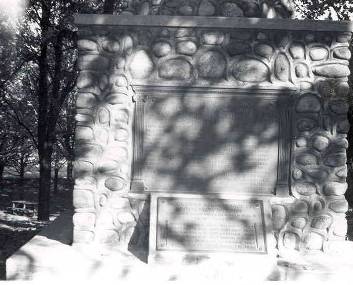 Cenotaph with bronze commemorative plaques in Memorial Park, Cookstown. The plaques bear the names and death dates of soldiers from Cookstown and surrounding area who died in World War I and World War II.