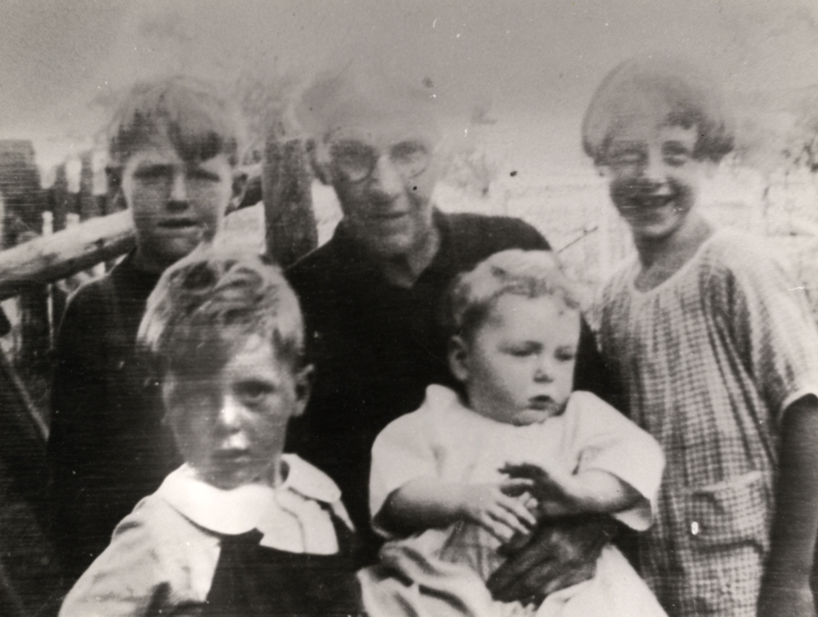 Photo of Mrs. Margey Dyer (née Maley, wife of Alfred Dyer) with her grandchildren through her son Arthur Dyer and daughter-in-law Ethel Robertson. Pictured in the front row are Edgar and Gordon, and in the back row are Alfred and Marie (later Mrs. Archie Graham).