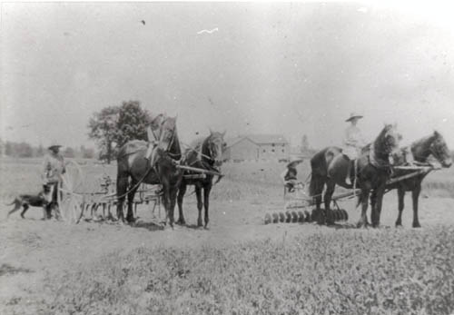 Cultivating and harrowing on the farm of William J. Goodfellow. Pictured on the far left with the dog is William J. Goodfellow, and Ward Goodfellow on the next horse. Sitting on cultivator is Roy Goodfellow, and on the horse (far right) is Isabel Goodfellow.