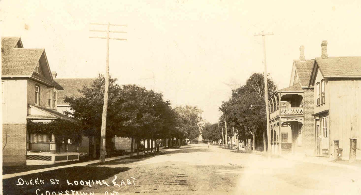 Photo showing a view of Queen Street in Cookstown. The photo has been labelled as looking east; however, the distinctive architecture of the porch of the building on the right indicates that it is the former Couse's store meaning the view actually faces west. The photo shows dirt roads as well as hydro and telephone poles running along the street. A number of the buildings in the photo have changed or no longer exist.