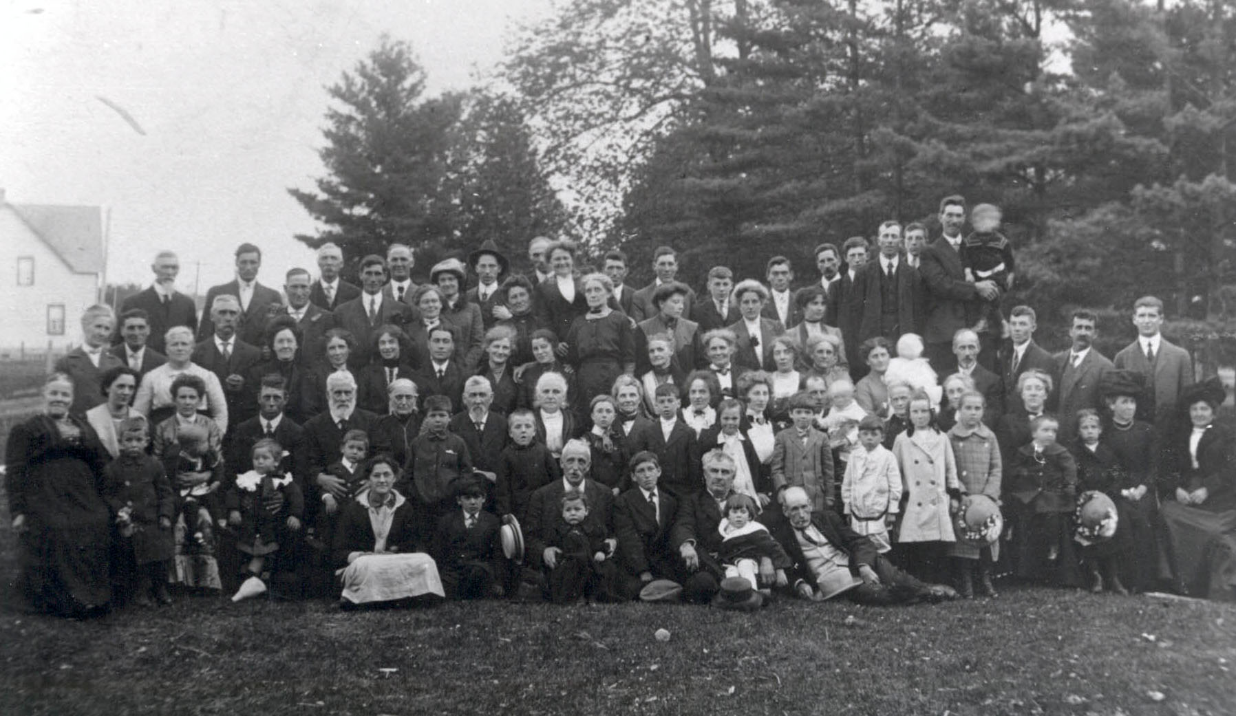 Photograph of the Grose Family Reunion, likely at Killarney Beach. At the extreme right standing and holding his son Stephen is Fred Morris.