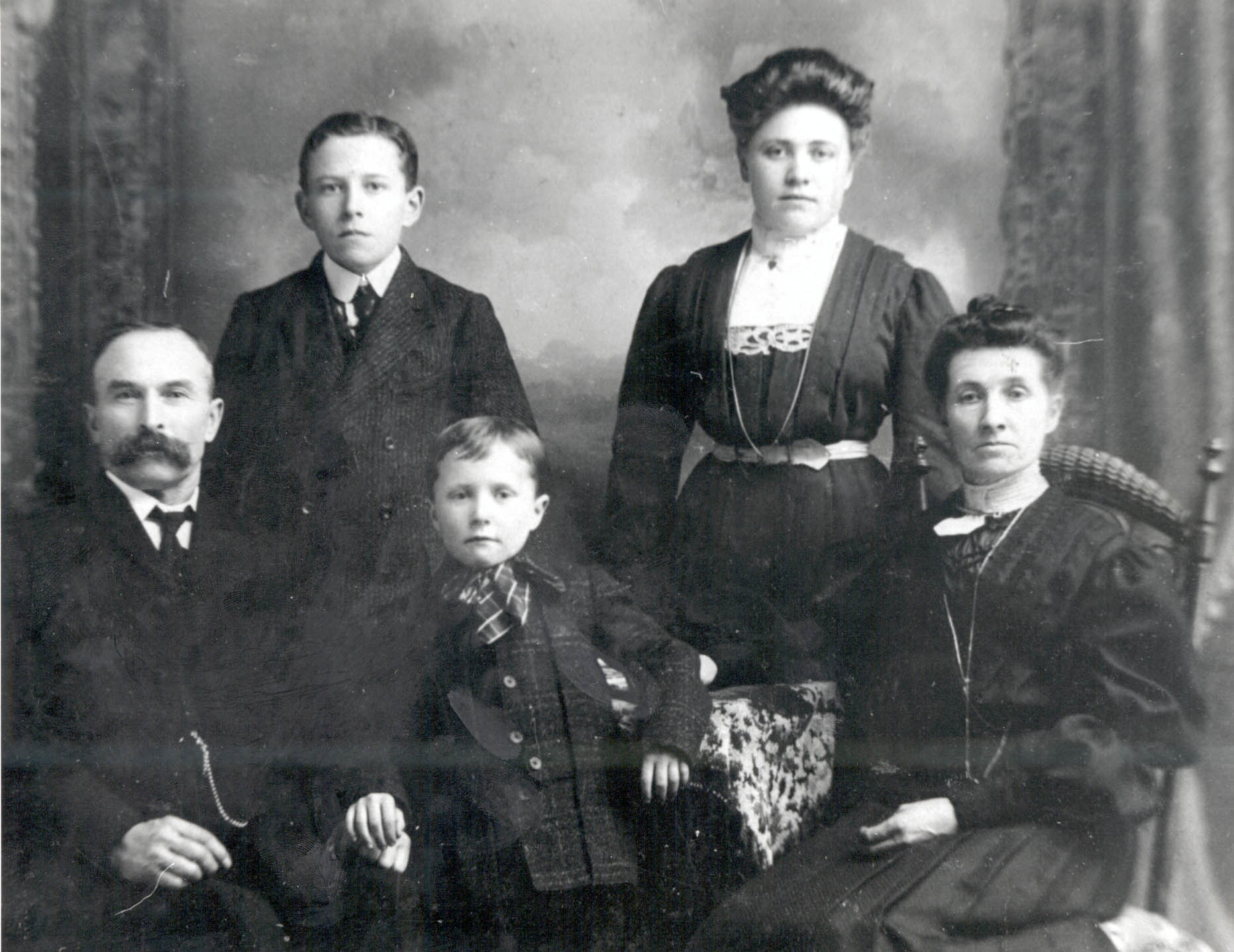 Guest family portrait. Pictured from left to right are Mr. Joshua Guest (1855 - 22 December 1922), Lloyd, Grant (front), Myrtle, and Mrs. Margaret Guest (née Sproule, 1861-1949). Joshua and Margaret were married in 1884.