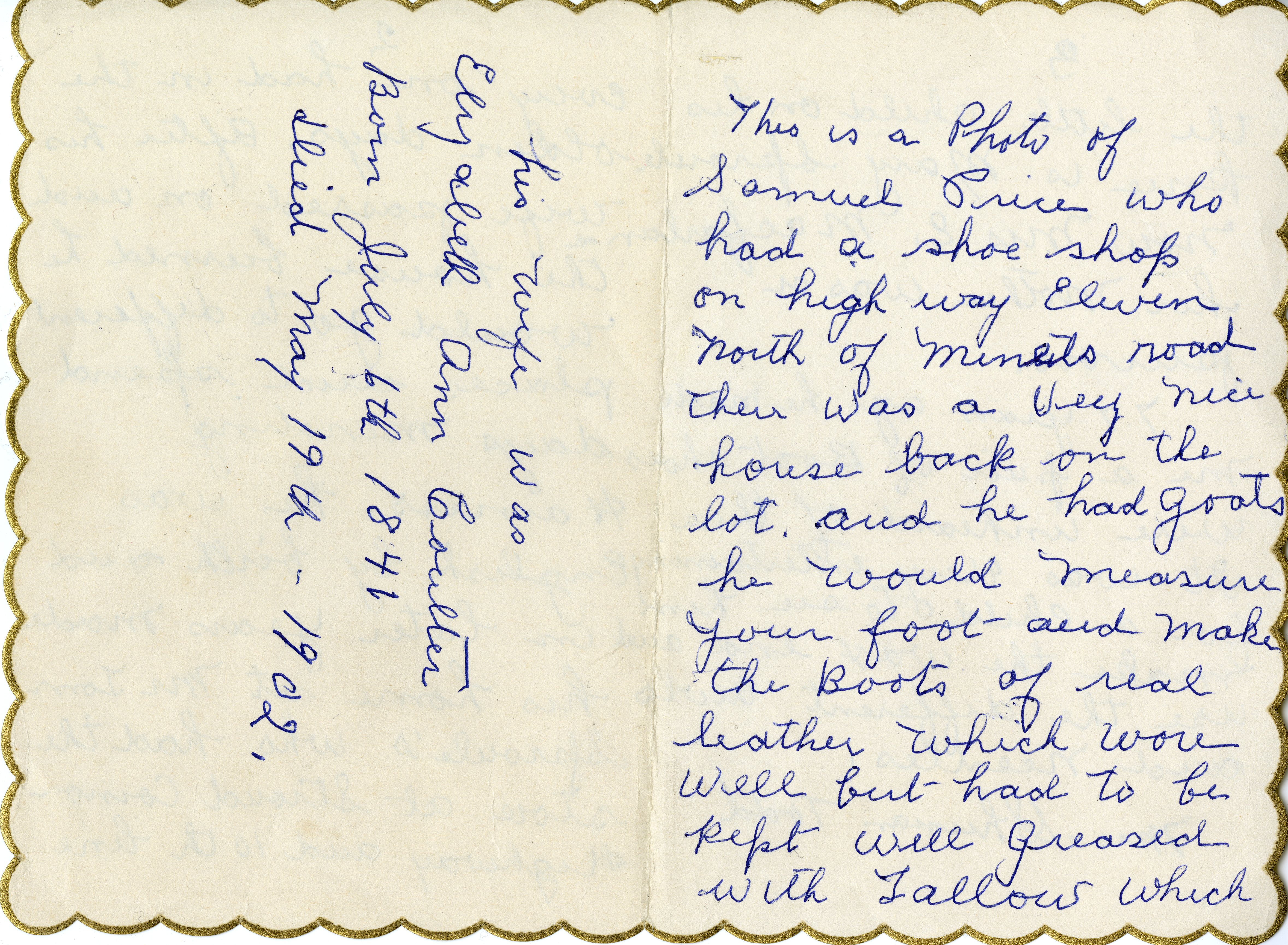 Letter with information about Samuel Price's shoe shop located on Highway 11, north of Minet's Point, from Mrs. Sherman Todd.