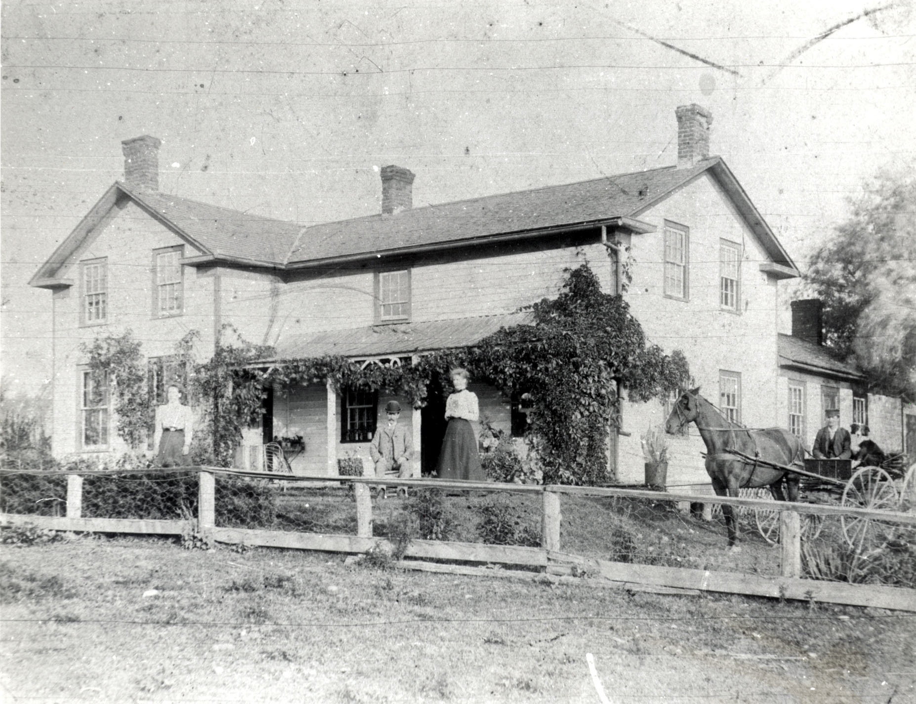 Photo of the Todd family in front of their home. Pictured from left to right are: unknown, Eben Todd, his wife Lucinda "Sinnie" (née Sproul), and Samuel Todd, father of Lois Sturgeon, in the buggy.