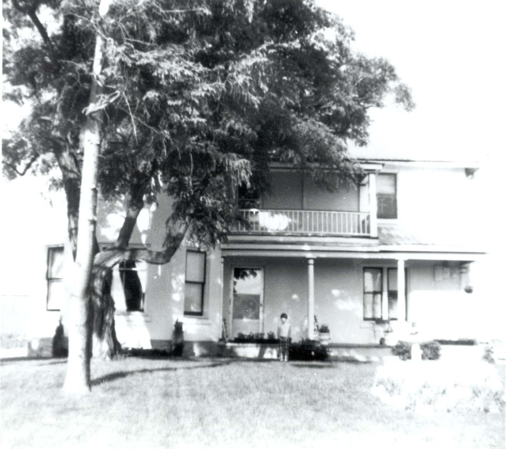 Photo of the home of Don McNabb, which was stuccoed about 1967. The home entered the McNabb family since 1919. There is a young unknown boy standing in front of the house on the lawn, as well as a large tree obscuring much of the second storey of the house.