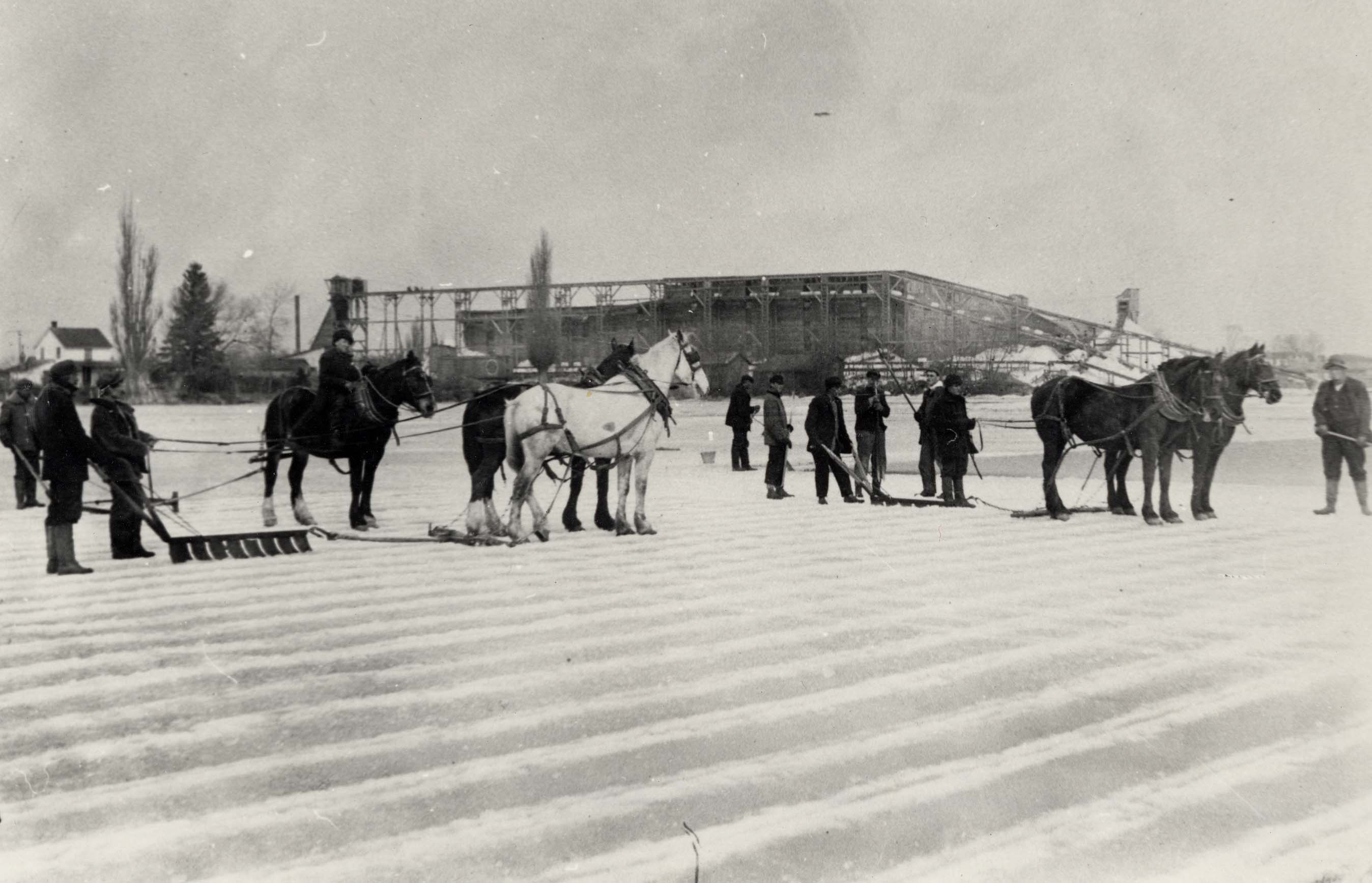 Photo of two teams of horses and several men per team standing on the ice of Lake Simcoe, preparing to cut the ice into blocks for use home ice boxes. The cut blocks of ice would be stored in an ice house, which is visible in the background, before being shipped throughout the community and beyond.