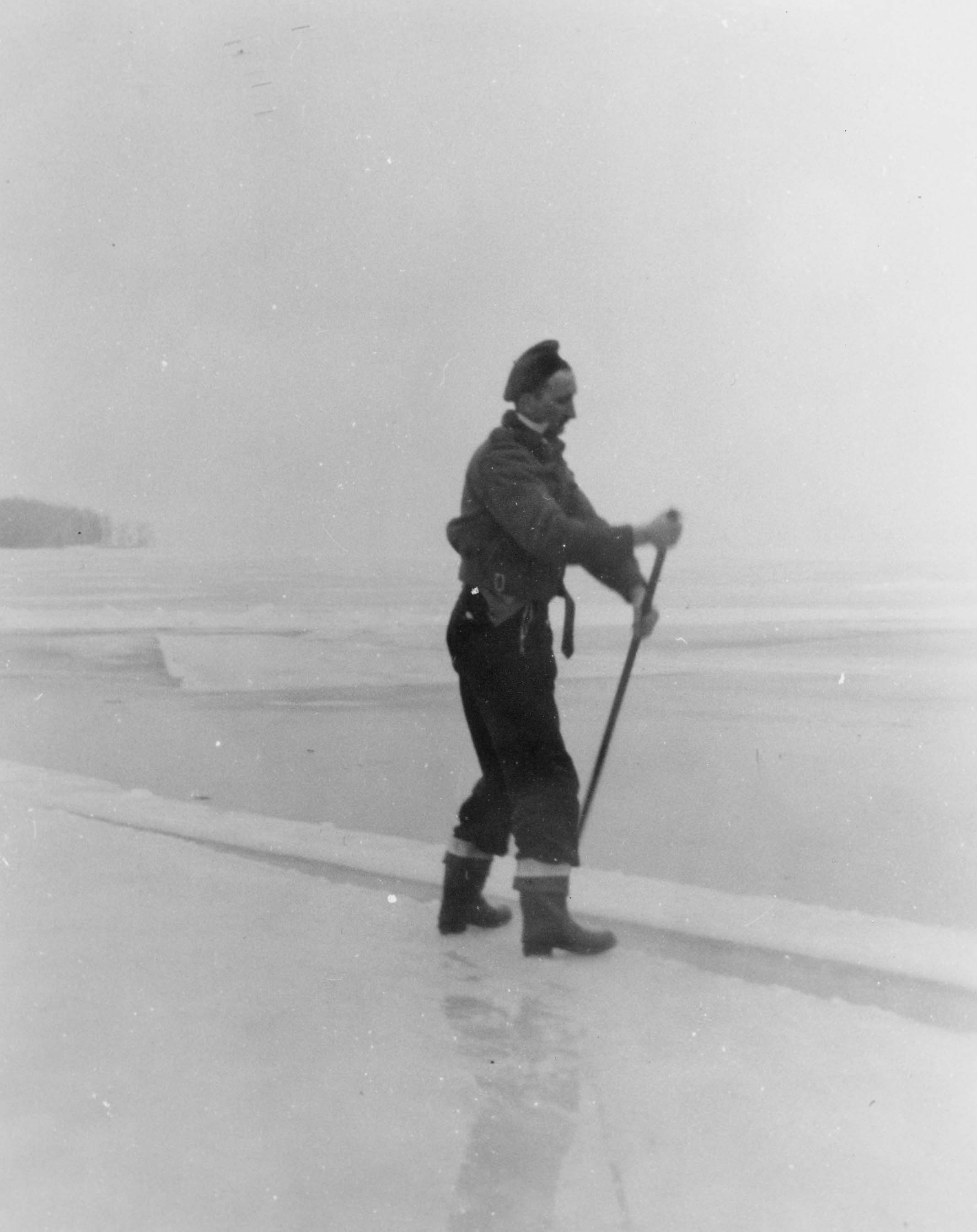 Photo of Wallace Wright in rubber boots and a cap cutting ice on Lake Simcoe and floating ice blocks down the channel to the elevator using a long pole.