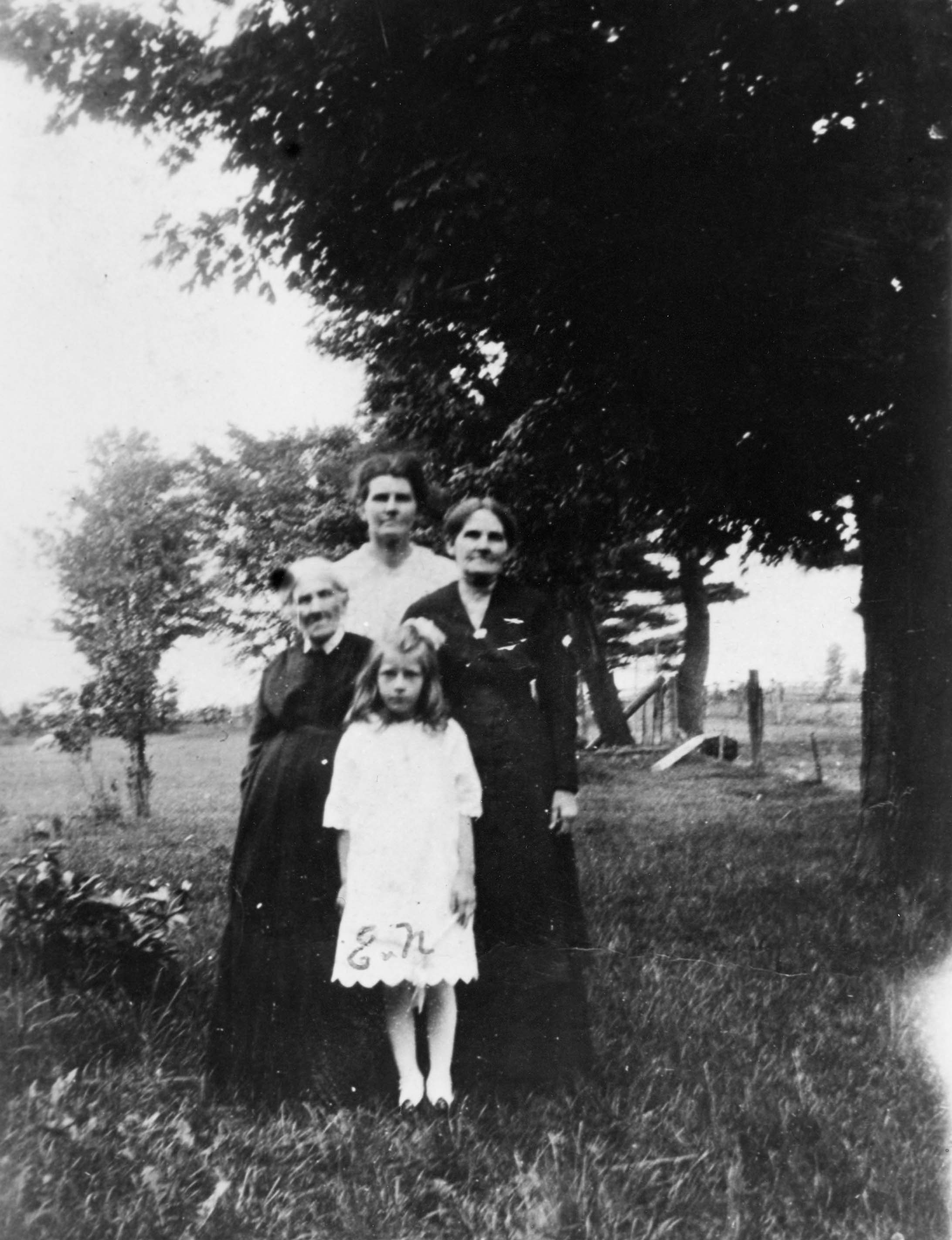 Photo of four women wearing dresses and standing in a tight group. They represent four generations of the Hubbert Family. From left to right they are Mrs. William Hubbert (née Ann Teasdale, 1831-1924) and her daughter Mrs. William Hopkins (née Rebecca Hubbert, 1860-1924). In the back is Mrs. Albert Pratt (née Annie Hopkins, 1885-1957), and the young girl standing in front is Edith Pratt.