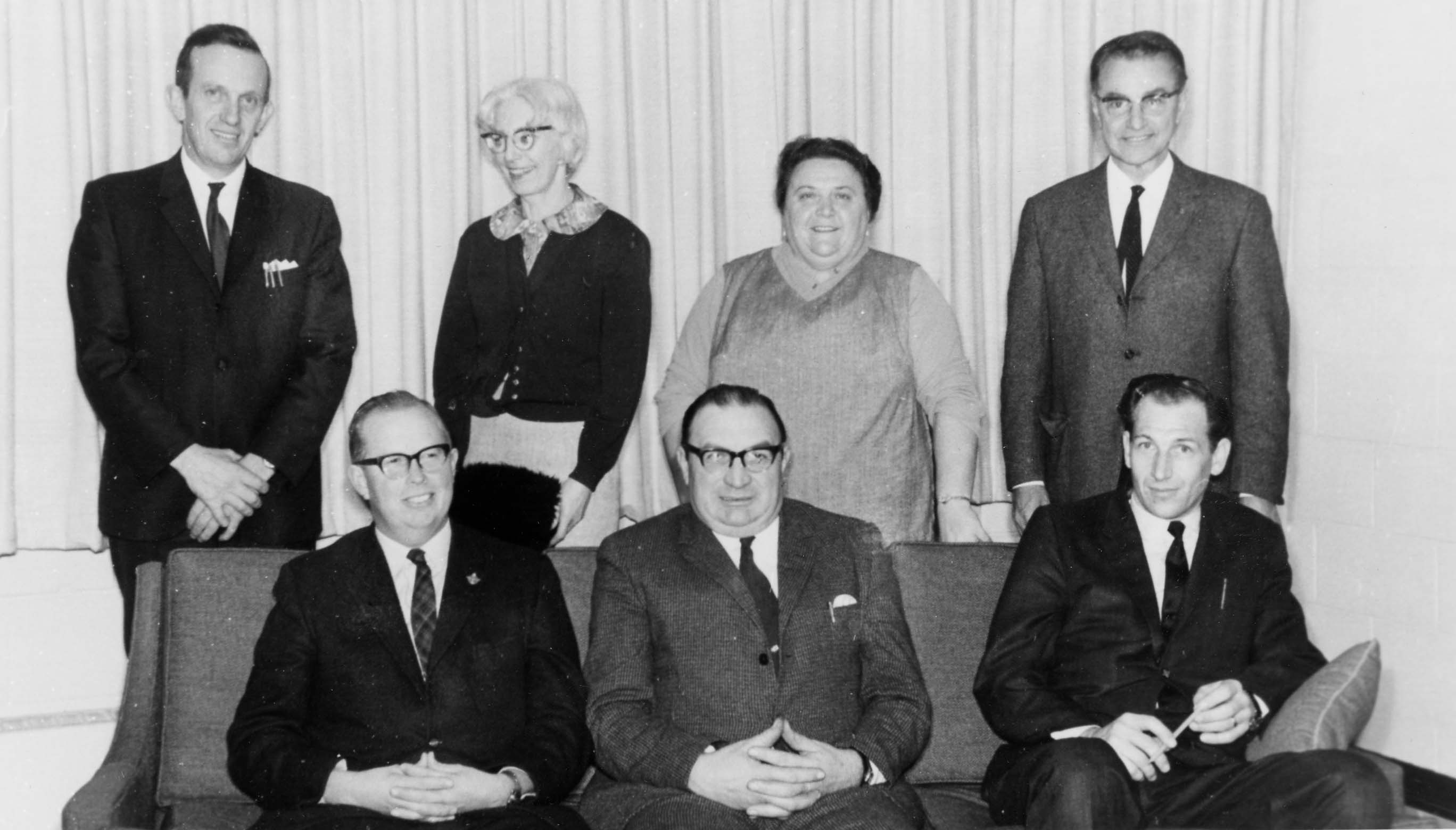 Posed group photo taken of the last School Board for Innisfil Township in 1965. Pictured from left to right - Back Row: Frank Kell, Seepe Walters, Kathe Jans, and Roy Macklem (Inspector). Seated in the Front Row: Roy Lennox, Don Beatty (Chairman), and Duncan Coutts.