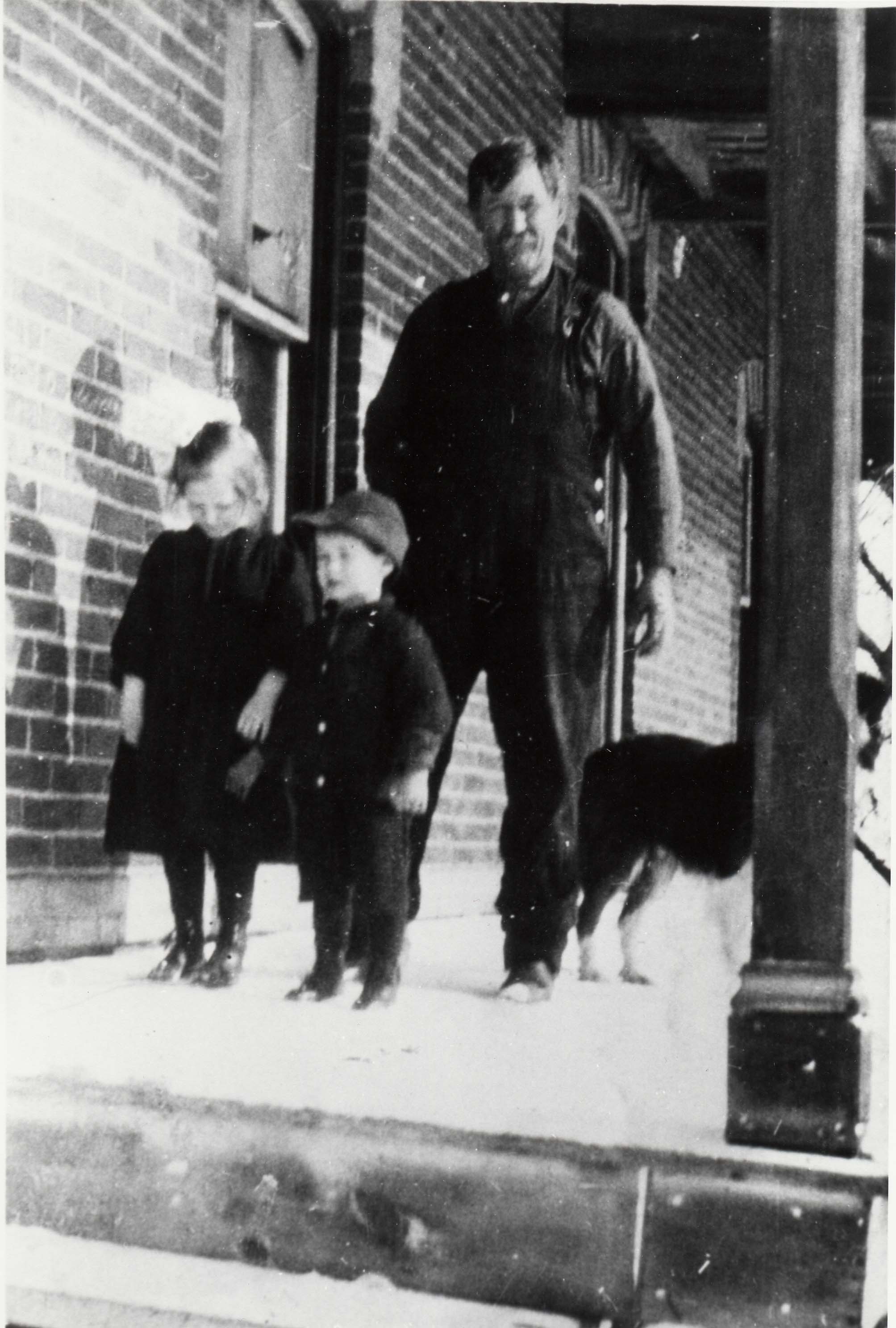Candid photo of Thomas Irving (born 1850) standing on the porch of his home on the 11th line, just behind his two young children Christina (left) and Lewis (right). The family dog is also standing near Thomas, but is partially obscured by a post. The home was located on the south half of lot 14, concession 10. Thomas was the youngest son of Jane and James Kennedy Irving, and was the couple's only child born in Canada after having emigrated from Scotland.