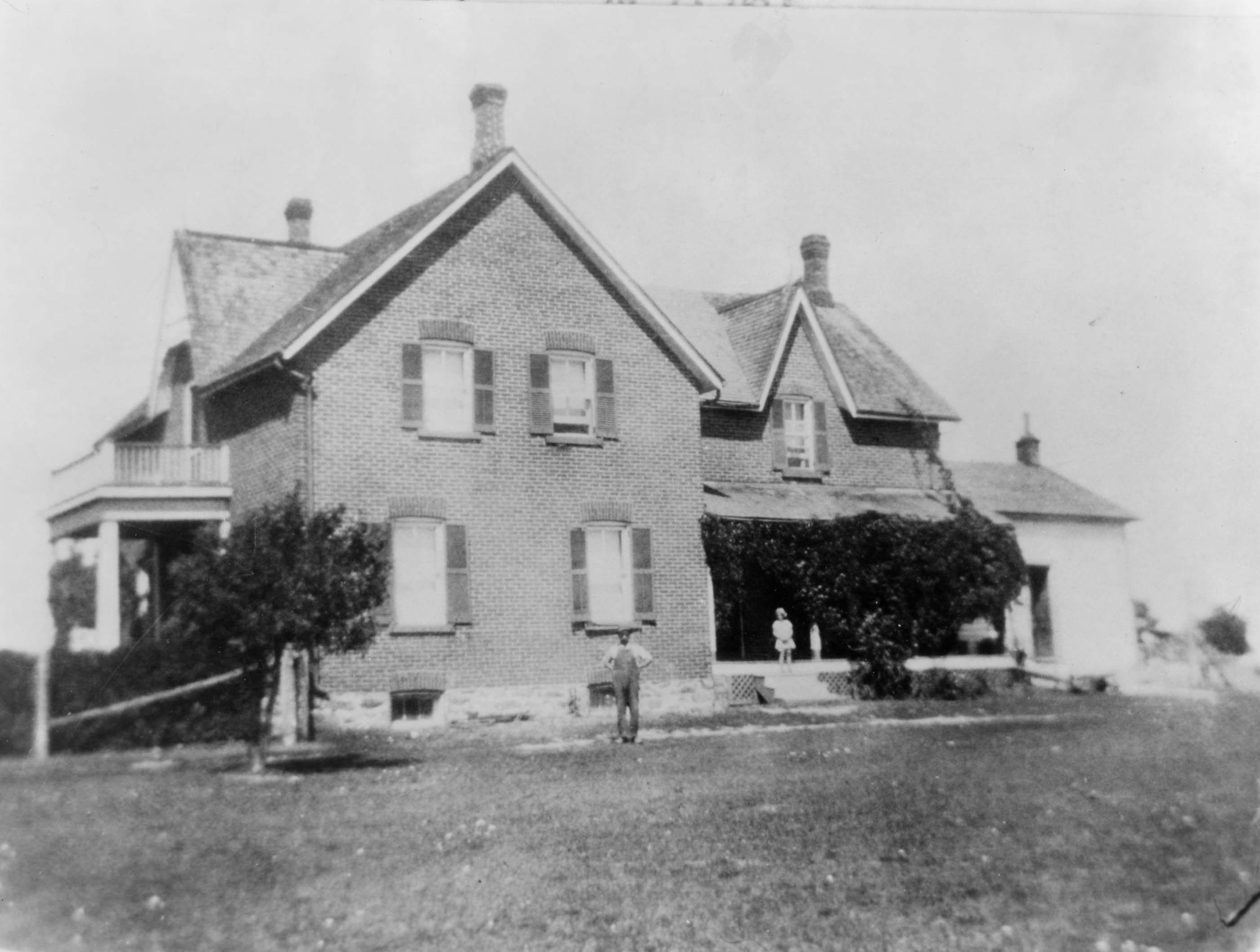 Photo of the exterior of the home of Mr. and Mrs. Dalton and Pearl Banting. The Bantings lived here from 1915 to 1948. It is a large two-storey brick home with decorative shutters on the windows and a side verandah and front porch (with a balcony for the second level above the front porch.) A man, likely Mr. Banting, is standing in front of the house dressed in overalls, and a young girl in a light coloured dress is standing on the steps to the verandah. Dalton Banting was born in Essa township in 1892 and married Pearl McCullough of SH Lot 19, Conc. 6, Innisfil on 14 July 1915. They had four children: Charles Benjamin Wray, Kathleen, Norma, and Marion. Dalton Banting served as Reeve in Innisfil for two years; as Deputy-Reeve for two years, and as Councillor for seven years. He died in 1979.
