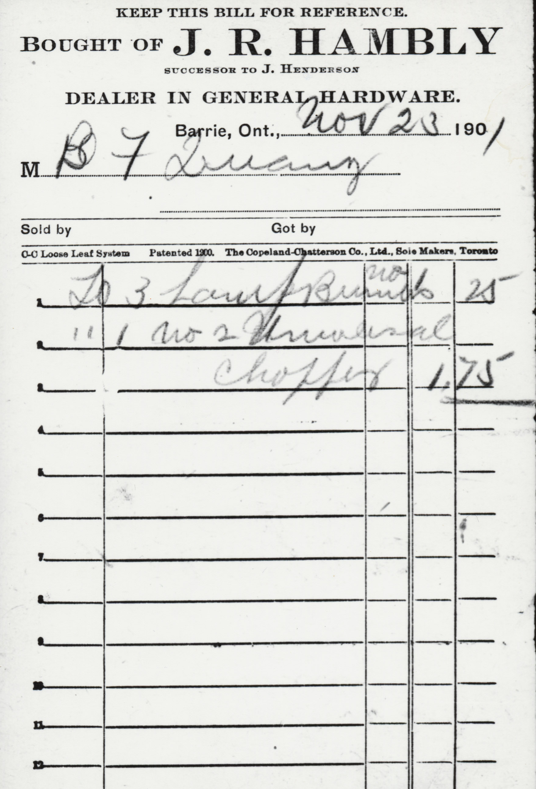Bill - November 23, 1901 from J.R. Hambly (General Hardware, Barrie) to B.F. Quantz, Innisfil, for lamp burners and Universal Chopper.