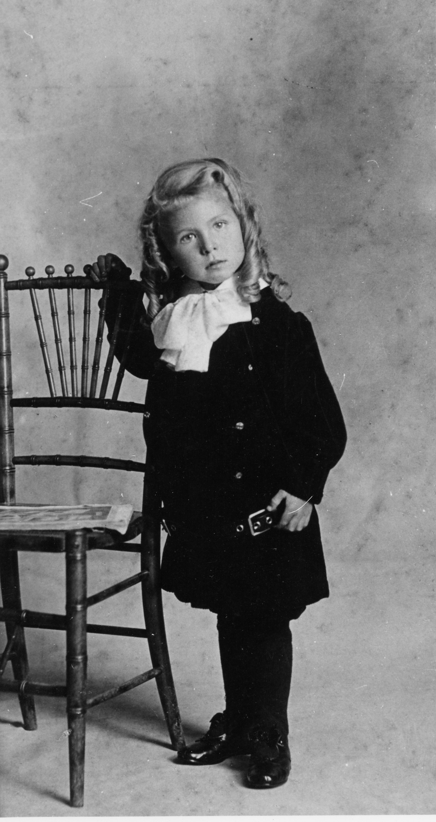 Frank Cowan (age of four) of Knock, posing beside a chair wearing a long coat and ruffled collar.
