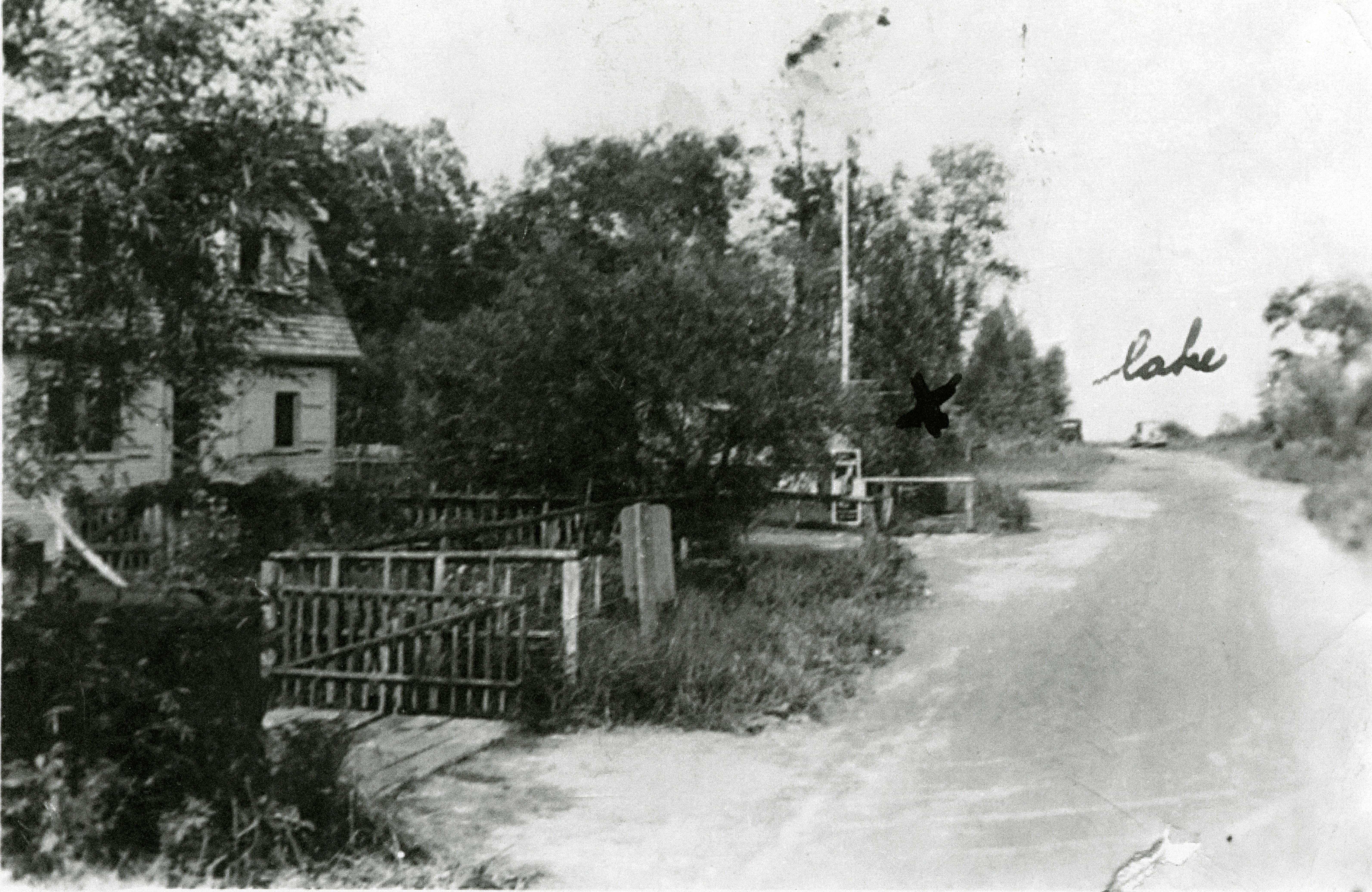 Photo taken from the west looking down the 9th Line road towards Lake Simcoe is a picture of a store at the foot of the Ninth Line of Innisfil. The stretch of road appears empty on the right, but lined with cottages, trees, and small fences. The cottages are hidden by trees across the road are where the Noon, Belton, and Thorne families later visited in summer of 1944. . The original store and dance hall was built by Bob Robert and his wife Hazel (nee Jack). They had one son Paul. Several different persons continued running the store until the building was in a fire and had to be torn down. In 2014 the lot is empty.
