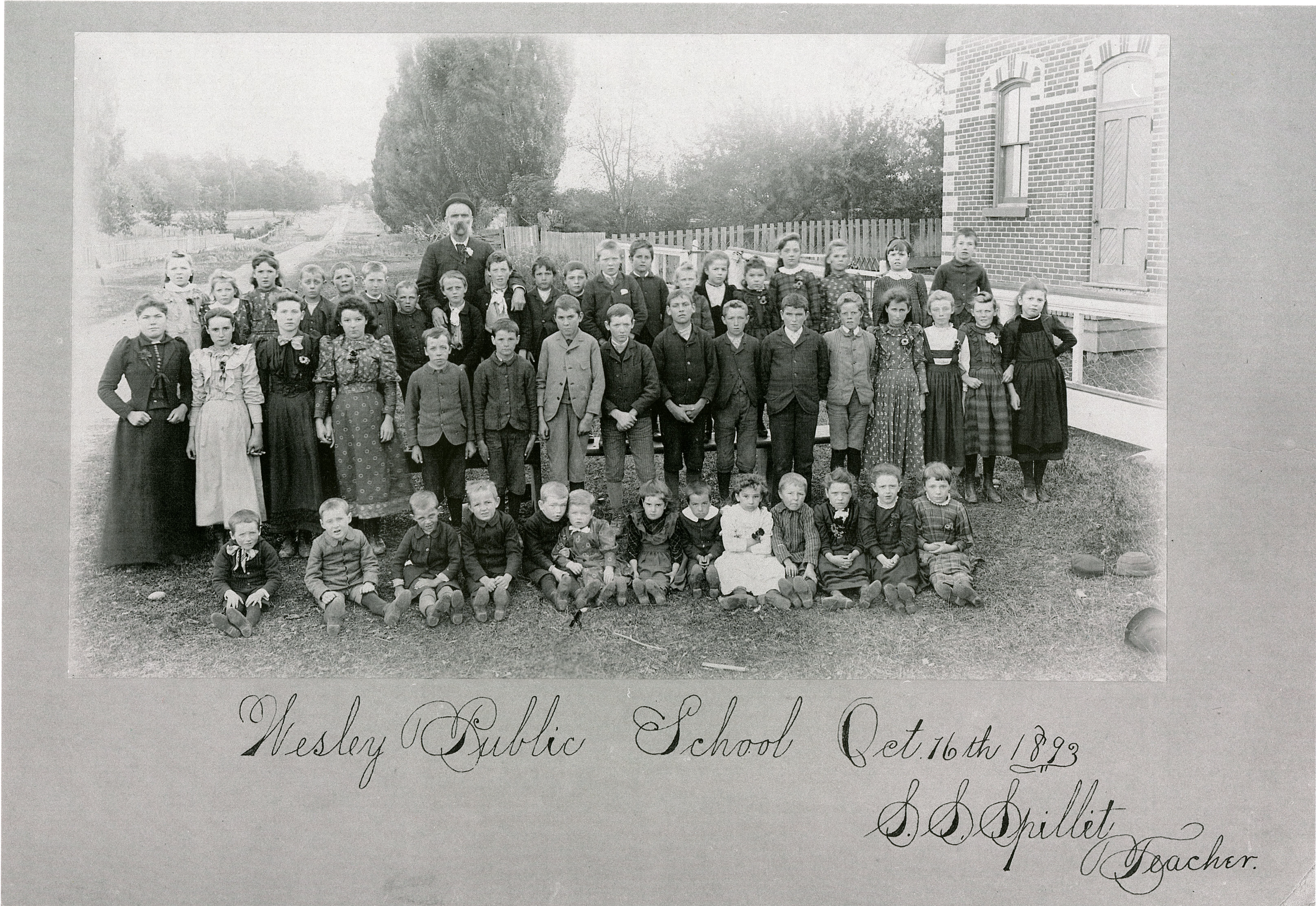 Stanley Spillette teacher at Wesley Public School, Nantyr. However, this building resembles the church once located at Nantyr. The children are dressed as if for Sunday. Therefore, the title would likely be Sunday School class.