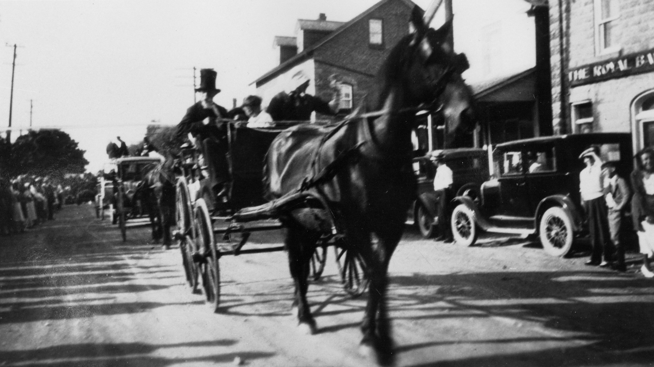 Photo taken of the Thornton Old Boys Reunion Parade. George Keast in the stovepipe hat is driving the horse-drawn wagon, and is holding a large doll. There is a large crowd gathered to watch the parade, and some parked cars and the Royal Bank building are visible on the right side of the photo.