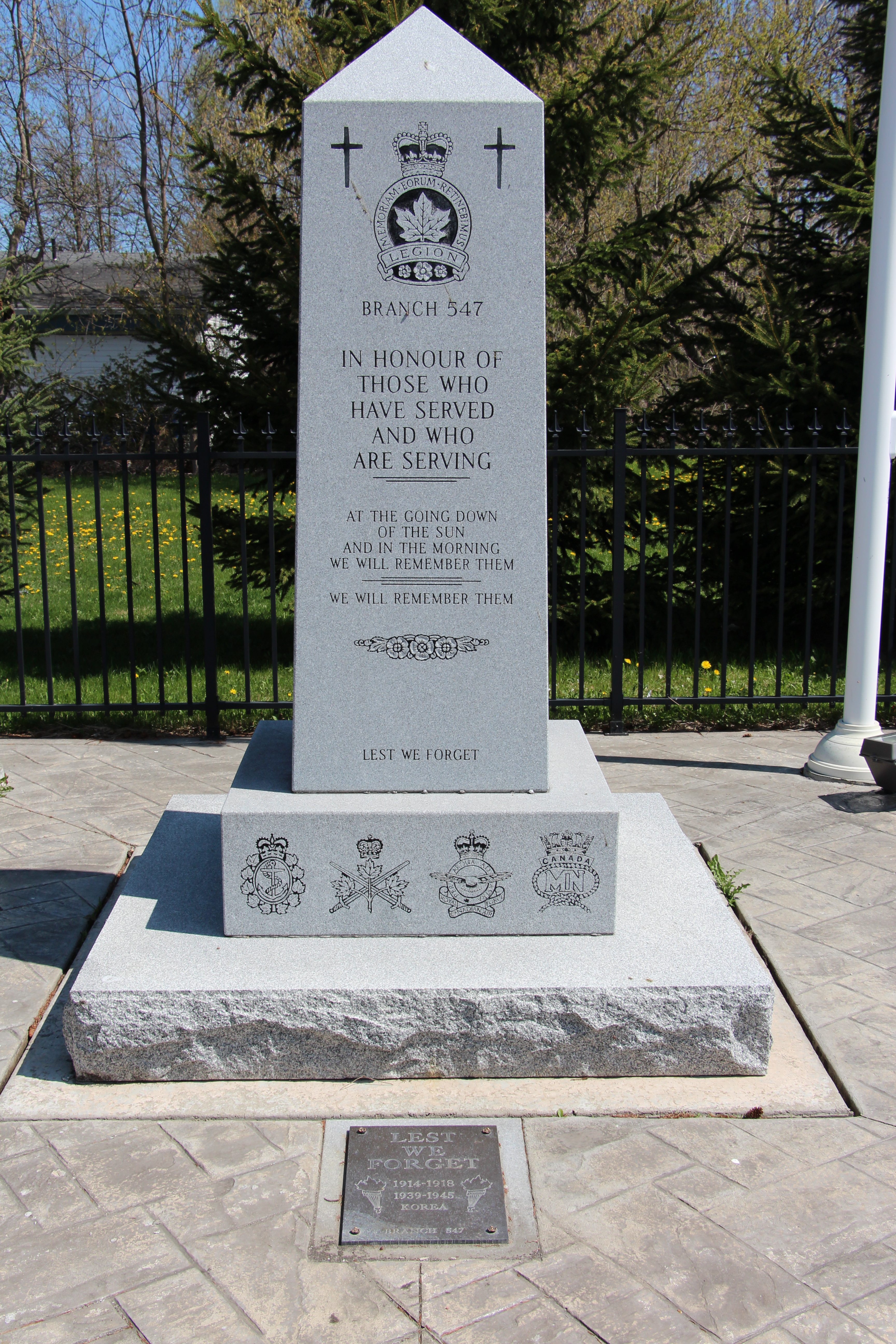 A stone obelisk bearing the insignia of the Royal Canadian Legion and the armed forces with a smaller second plaque on the ground in front of it that reads "Lest We Forget -- 1914-1918 -- 1939-1945 -- Korea -- Branch 547". The main inscription reads: "In honour of those who have served and who are serving - At the going down of the sun and in the morning we will remember them - We will remember them - Lest We Forget"