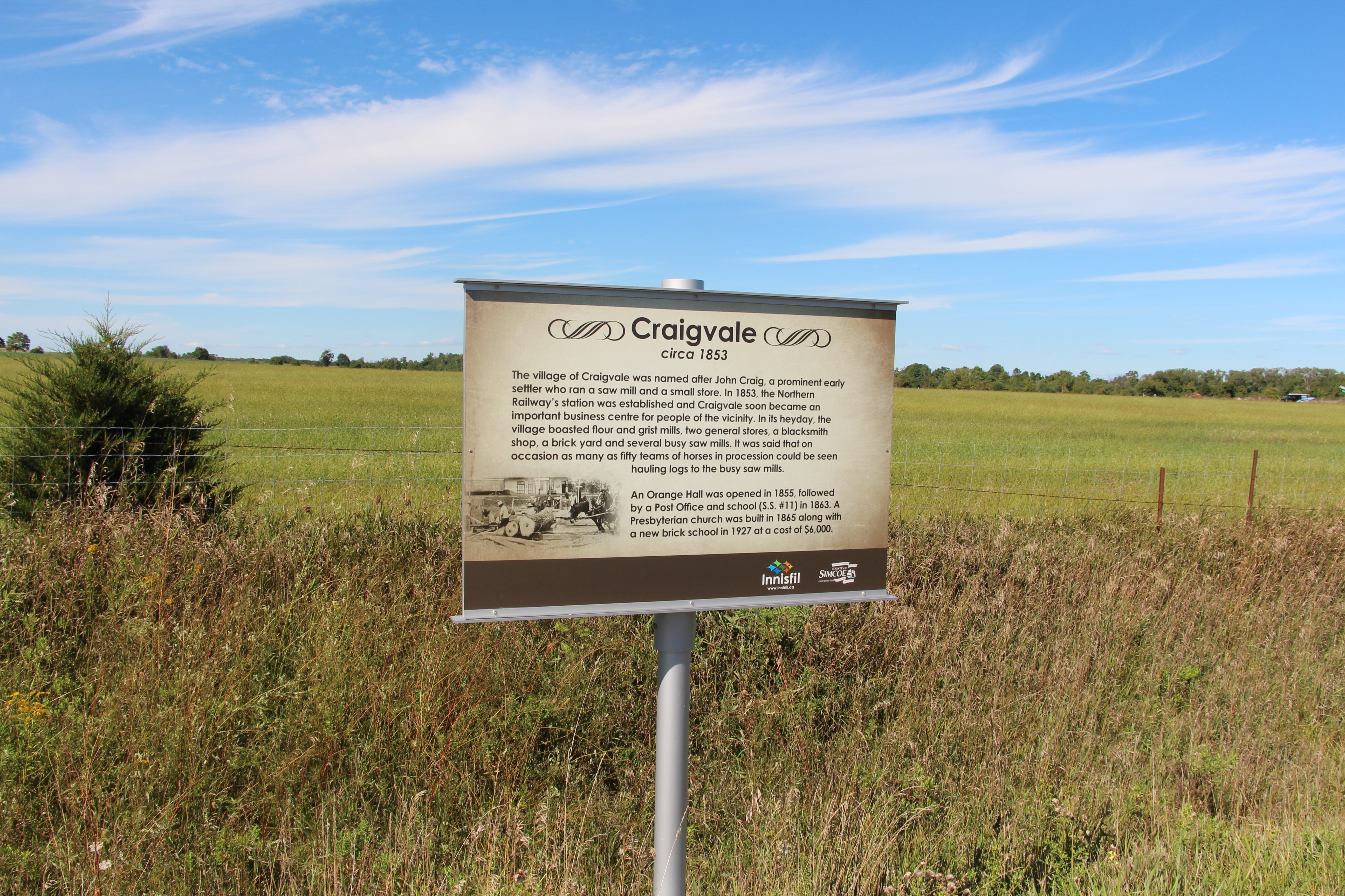 Historic plaque located on the 10th line of Innisfil. The plaque bears the logos of the Town of Innisfil and the County of Simcoe, as well as an image of several men and a team of horses hauling logs to a saw mill. The sign reads: "The village of Craigvale was named after John Craig, a prominent early settler who ran a saw mill and a small store. In 1853, the Northern Railway's station was established and Craigvale soon became a important business centre for people of the vicinity. In its heyday, the village boasted flour and grist mills, two general stores, a blacksmith shop, a brick yard and several busy saw mills. It was said that on occasion as many as fifty teams of horses in procession could be seen hauling logs to the busy saw mills. An Orange Hall was opened in 1855, followed by a Post Office and school (S.S. #11) in 1863. A Presbyterian church was built in 1865 along with a new brick school in 1927 at a cost of $6,000."