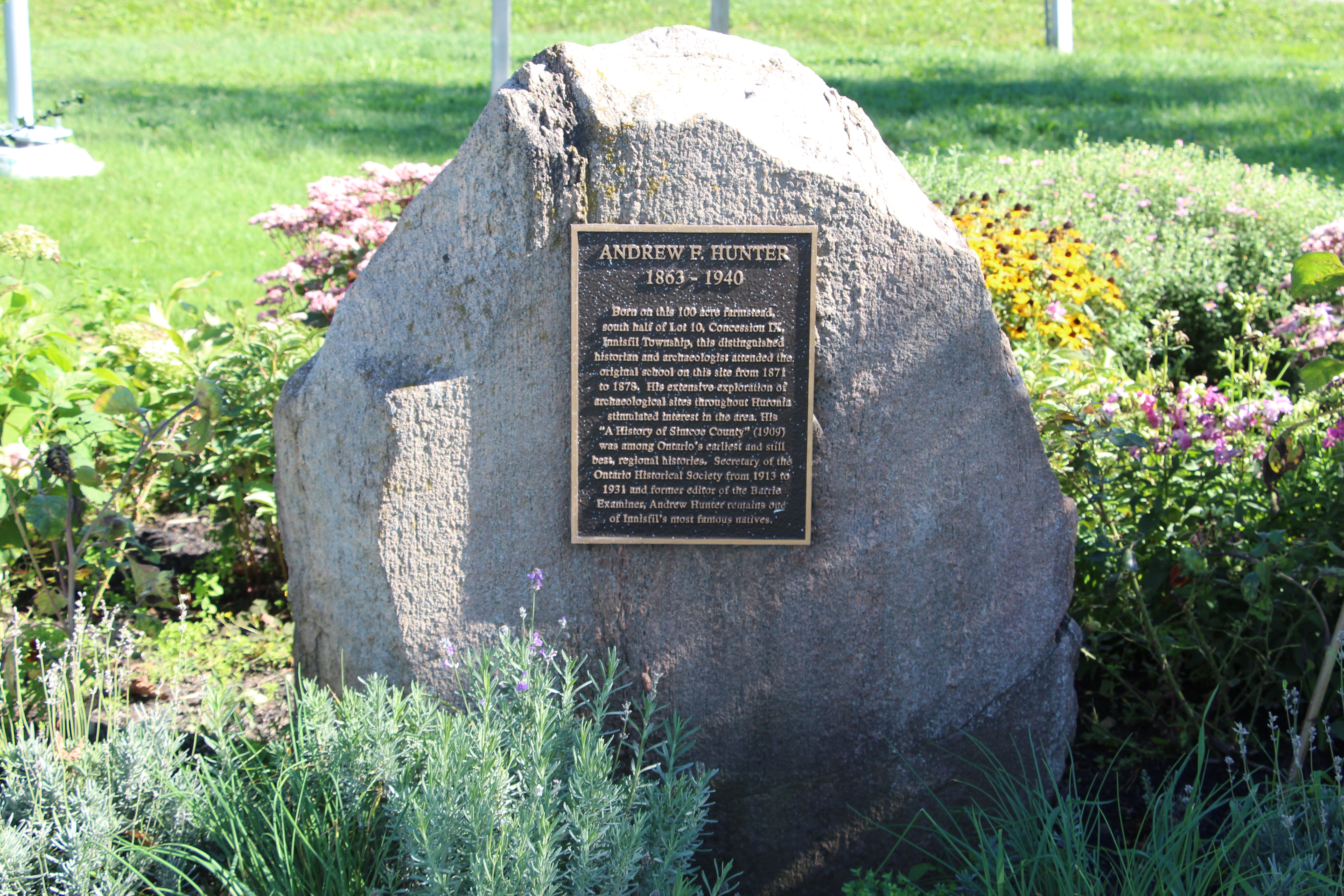 Bronze plaque mounted on a large stone in the garden near the entrance to Knock Community Hall on the corner of the 10th Sideroad and the 9th Line in Innisfil. The inscription reads: "Andrew F. Hunter 1863-1940 -- Born on this 100 acre farmstead, south half of Lot 10, Concession IX, Innisfil Township, this distinguished historian and archaeologist attended the original school on this site from 1871 to 1878. His extensive exploration of archaeological sites throughout Huronia stimulated interest in the area. His "A History of Simcoe County" (1909) was among Ontario's earliest and still best, regional histories. Secretary of the Ontario Historical Society from 1913 to 1931 and former editor of the Barrie Examiner, Andrew Hunter remains one of Innisfil's most famous natives."